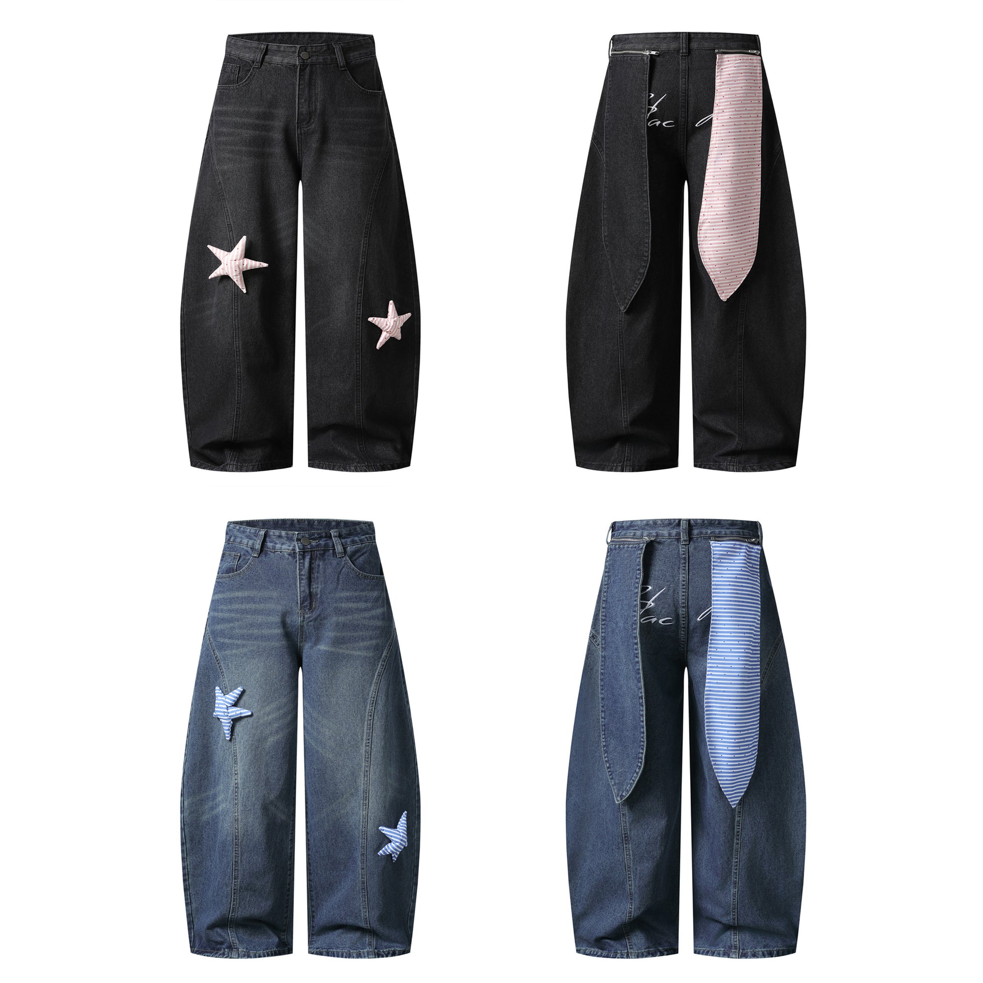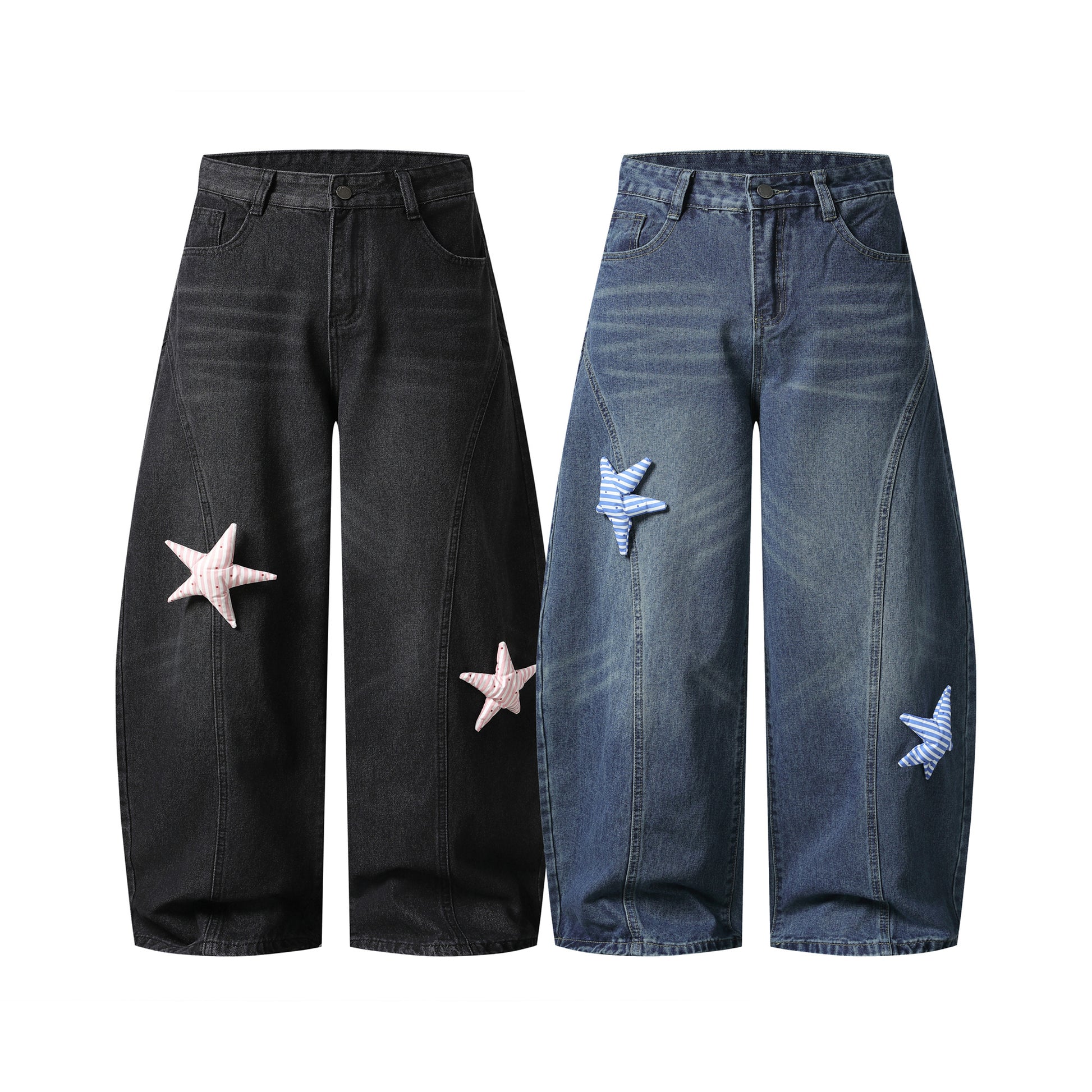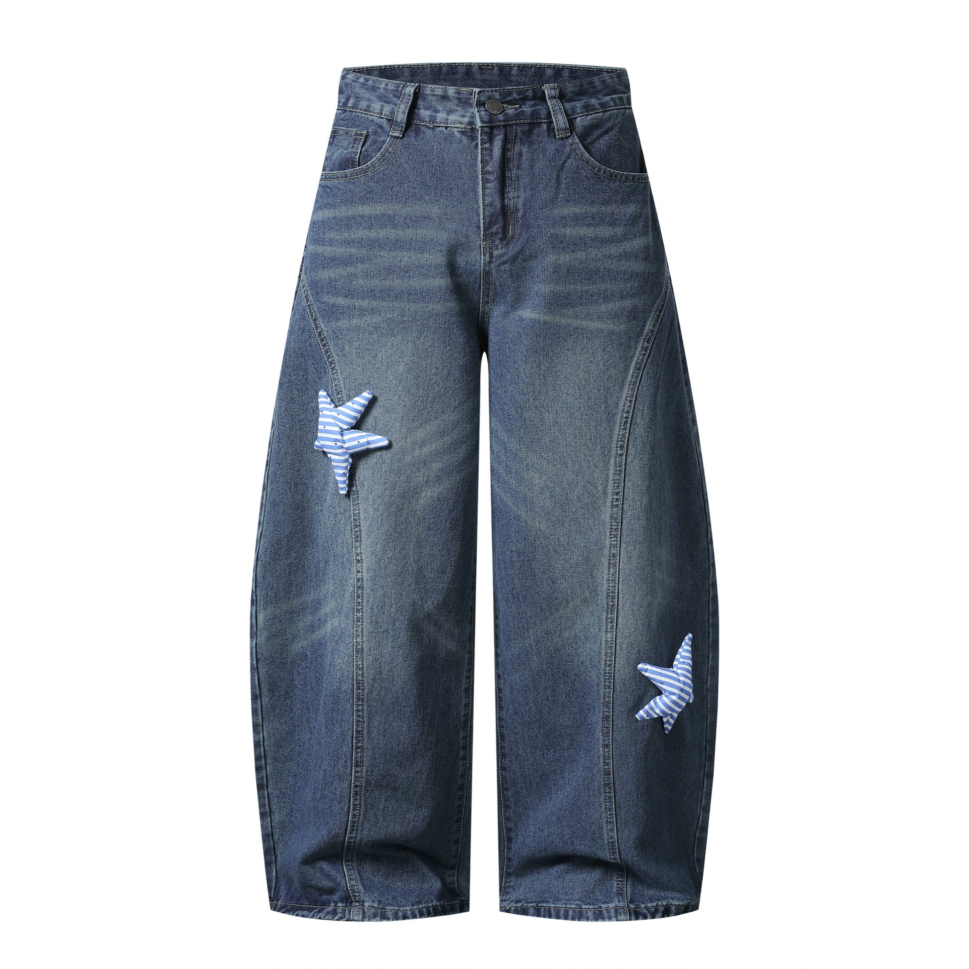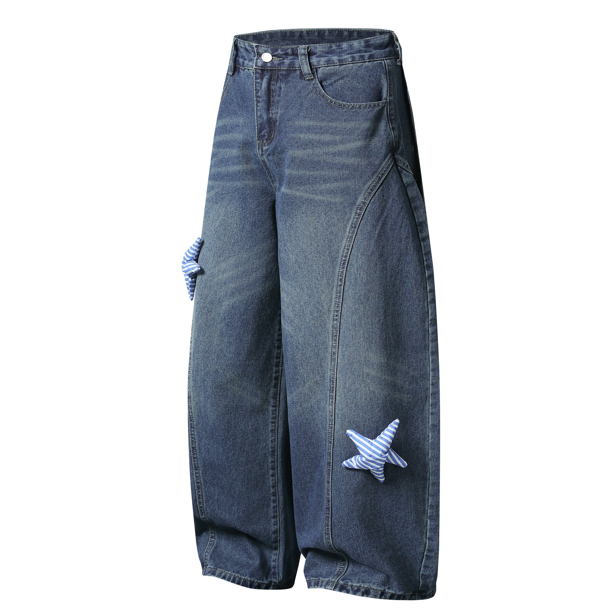 Clothing details: Star patch design, detachable stripe panel, wide-leg silhouette, washed finish, relaxed street fit.