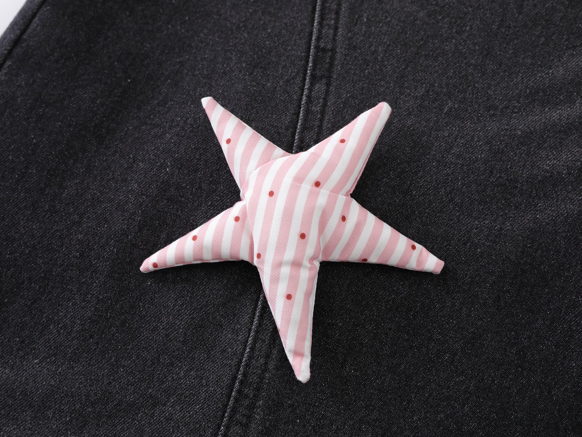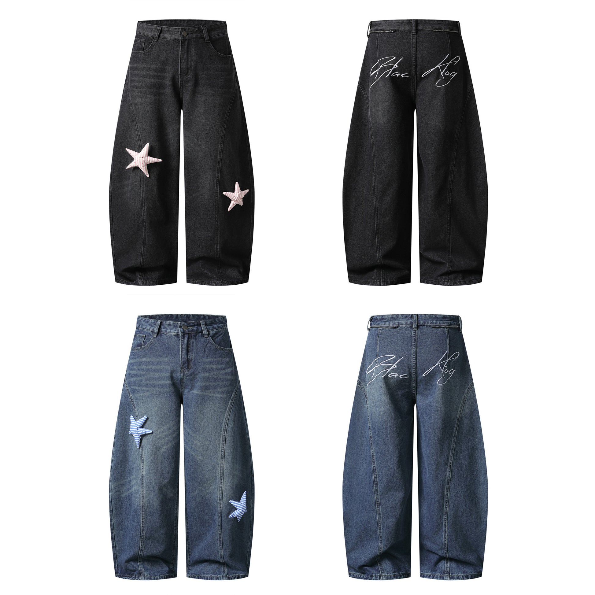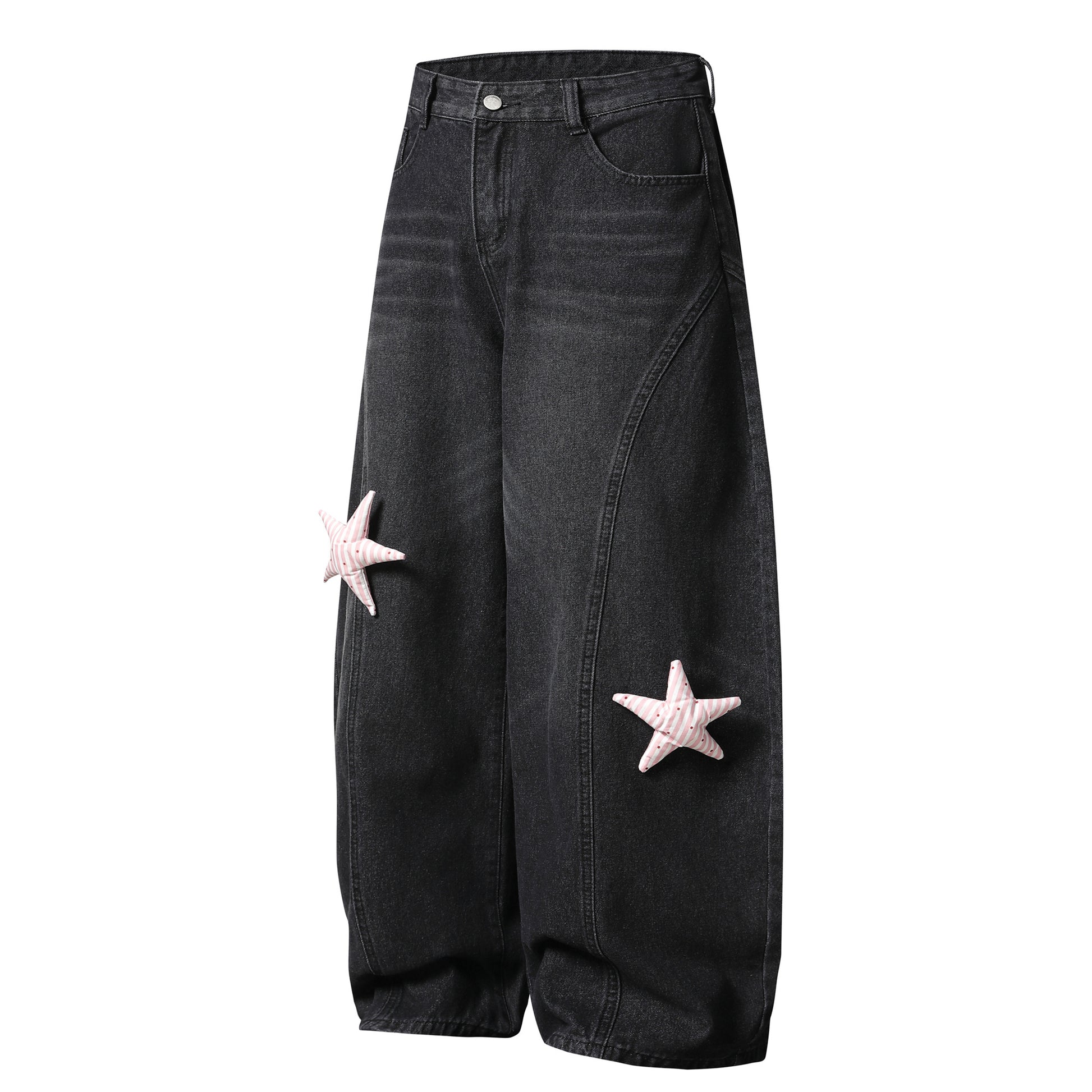 Clothing details: Star patch design, detachable stripe panel, wide-leg silhouette, washed finish, relaxed street fit.