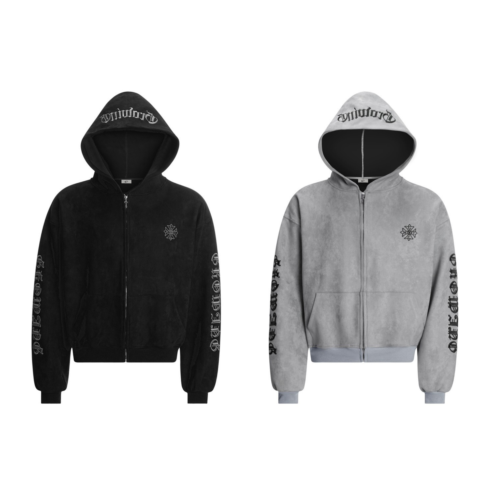 The Omirad Gothic Embroidered Suede Zip Hoodie fuses vintage streetwear energy with a dark, refined aesthetic. Crafted from soft suede-textured fabric, this hoodie features bold gothic embroidery on the hood and sleeves, paired with a minimalist cross motif at the chest. The plush feel and slightly structured shape make it a statement piece that balances comfort with attitude—perfect for layering or wearing solo.
