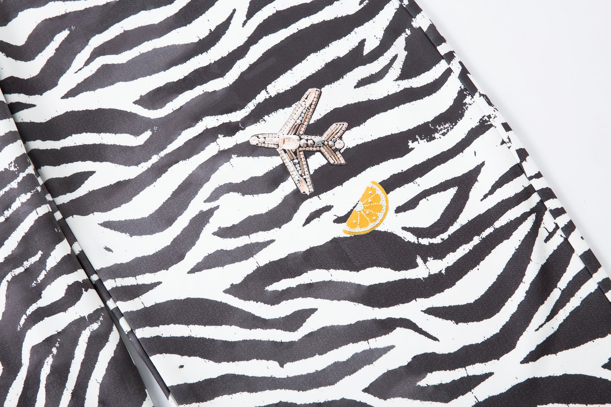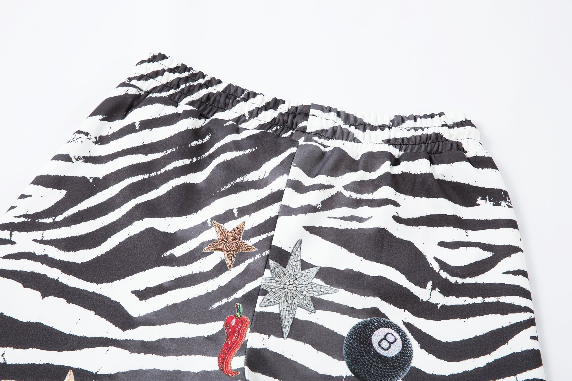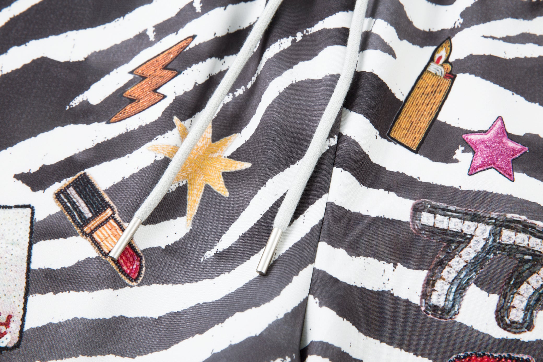 Clothing details: Zebra all-over print, embroidered and appliqué patches, elastic waistband with drawstring, relaxed wide barrel fit, Omirad street-art signature style.