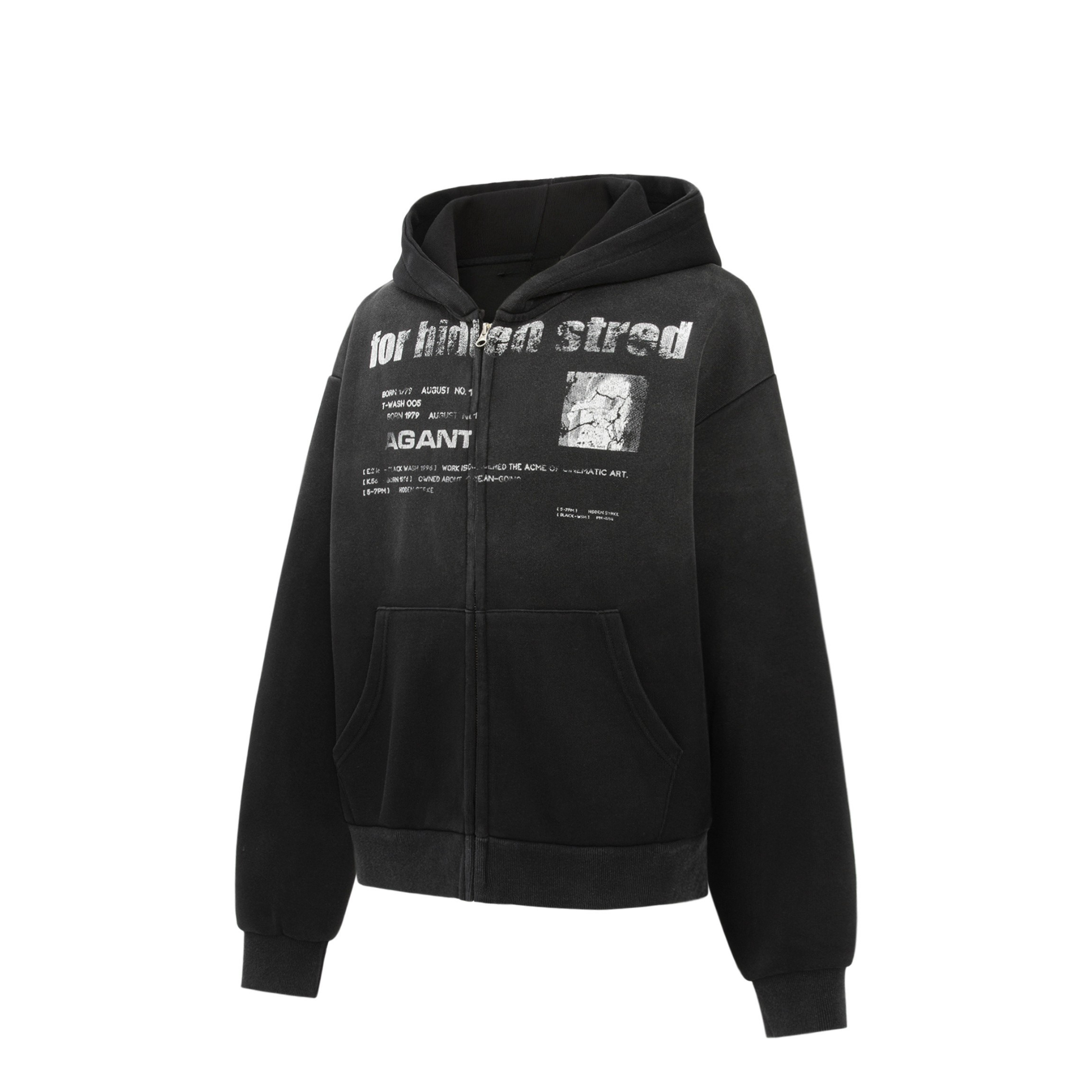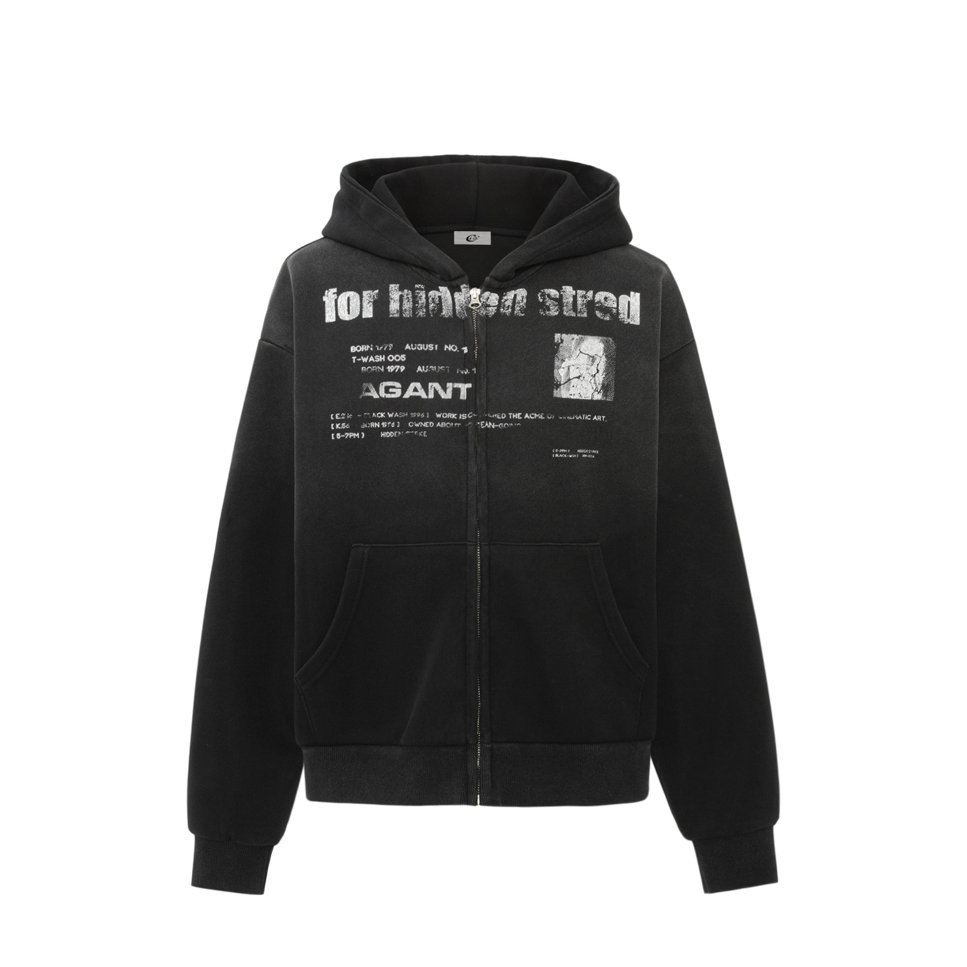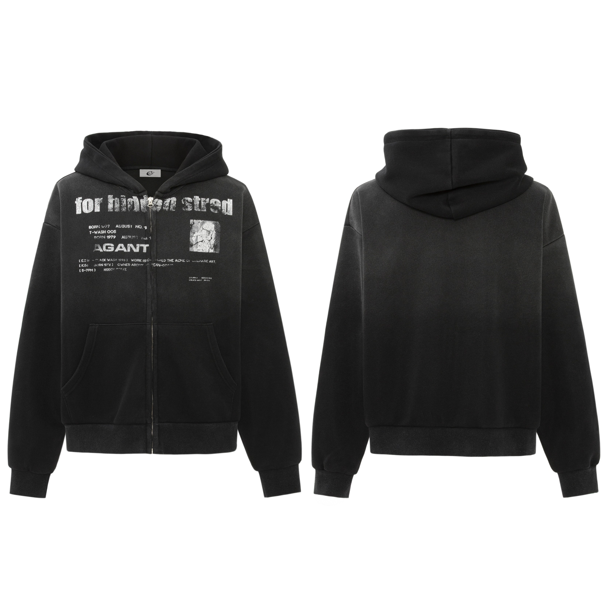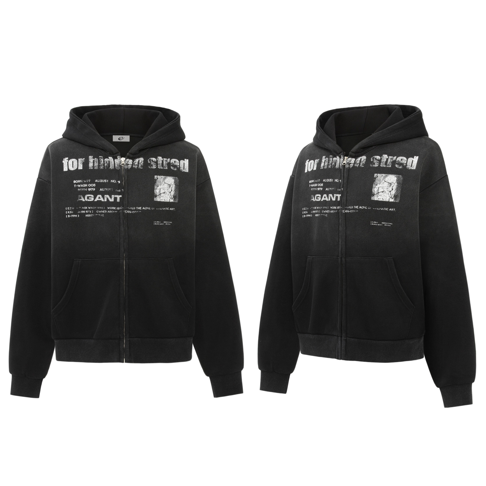 The Omirad Gradient Print Zip Hoodie captures a blend of street minimalism and vintage attitude. Crafted from 100% premium cotton, it features a faded gradient wash that creates a naturally worn texture. The chest is detailed with a bold distressed text graphic and abstract imagery, giving it a rugged, artistic edge. A relaxed silhouette, front zipper, and kangaroo pocket complete the look — perfect for laid-back yet expressive streetwear styling.