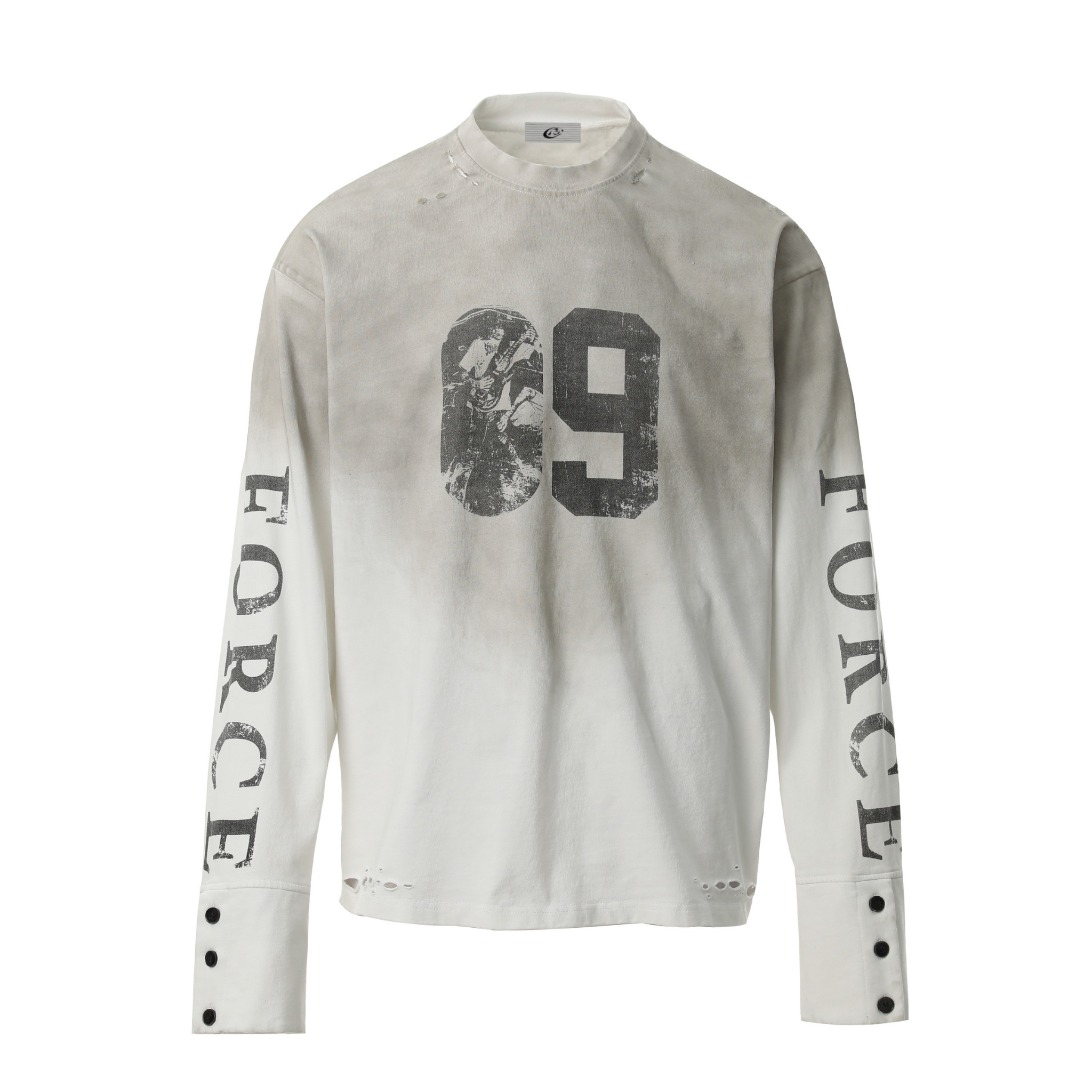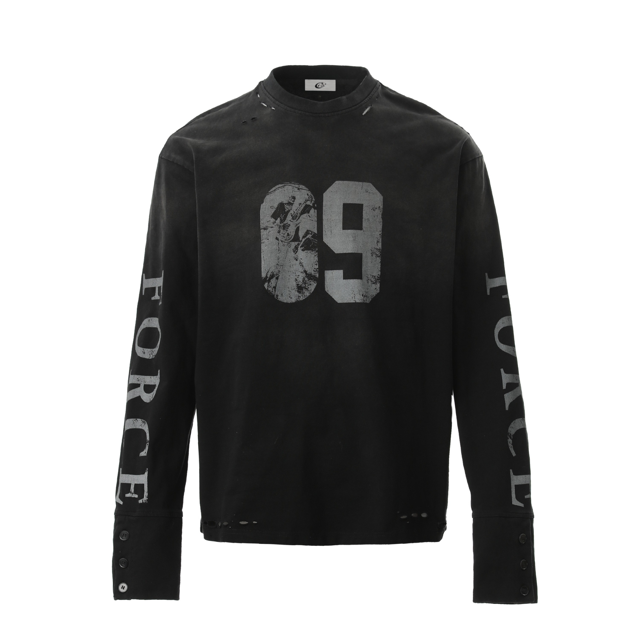 Clothing details: Distressed number graphic, sleeve lettering print, subtle hole distressing, button-accent cuffs