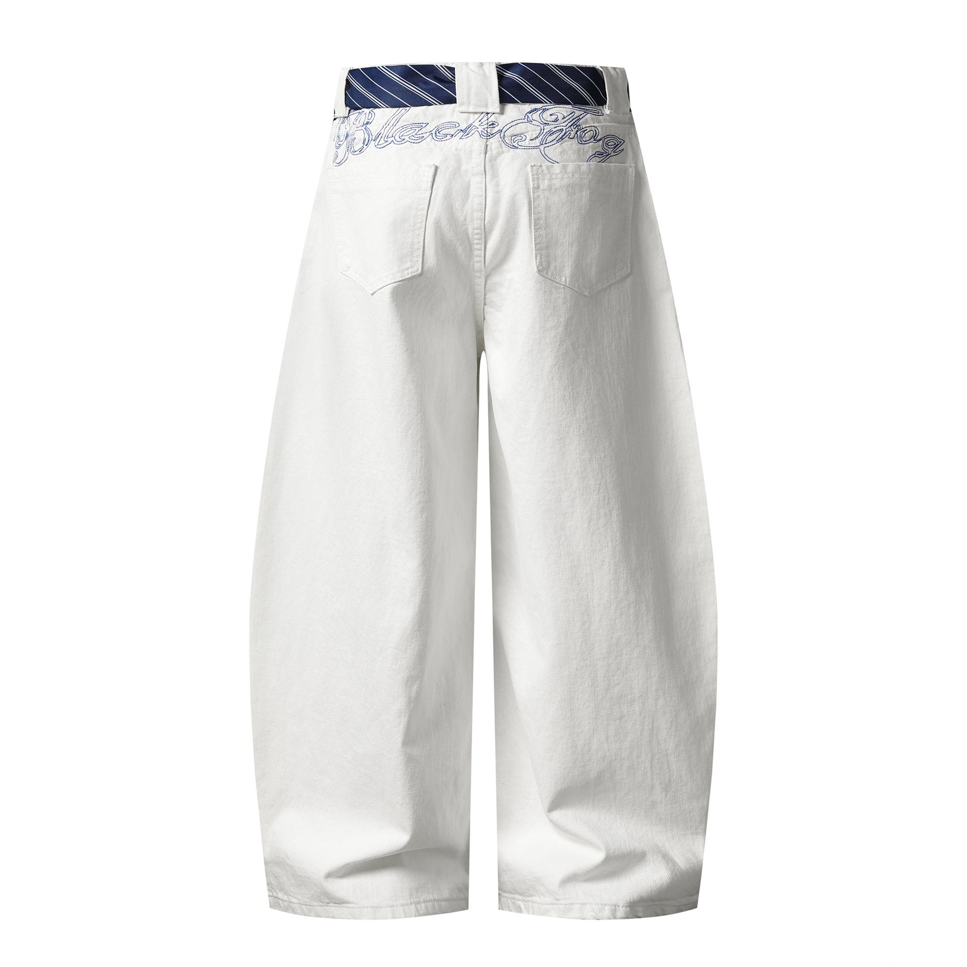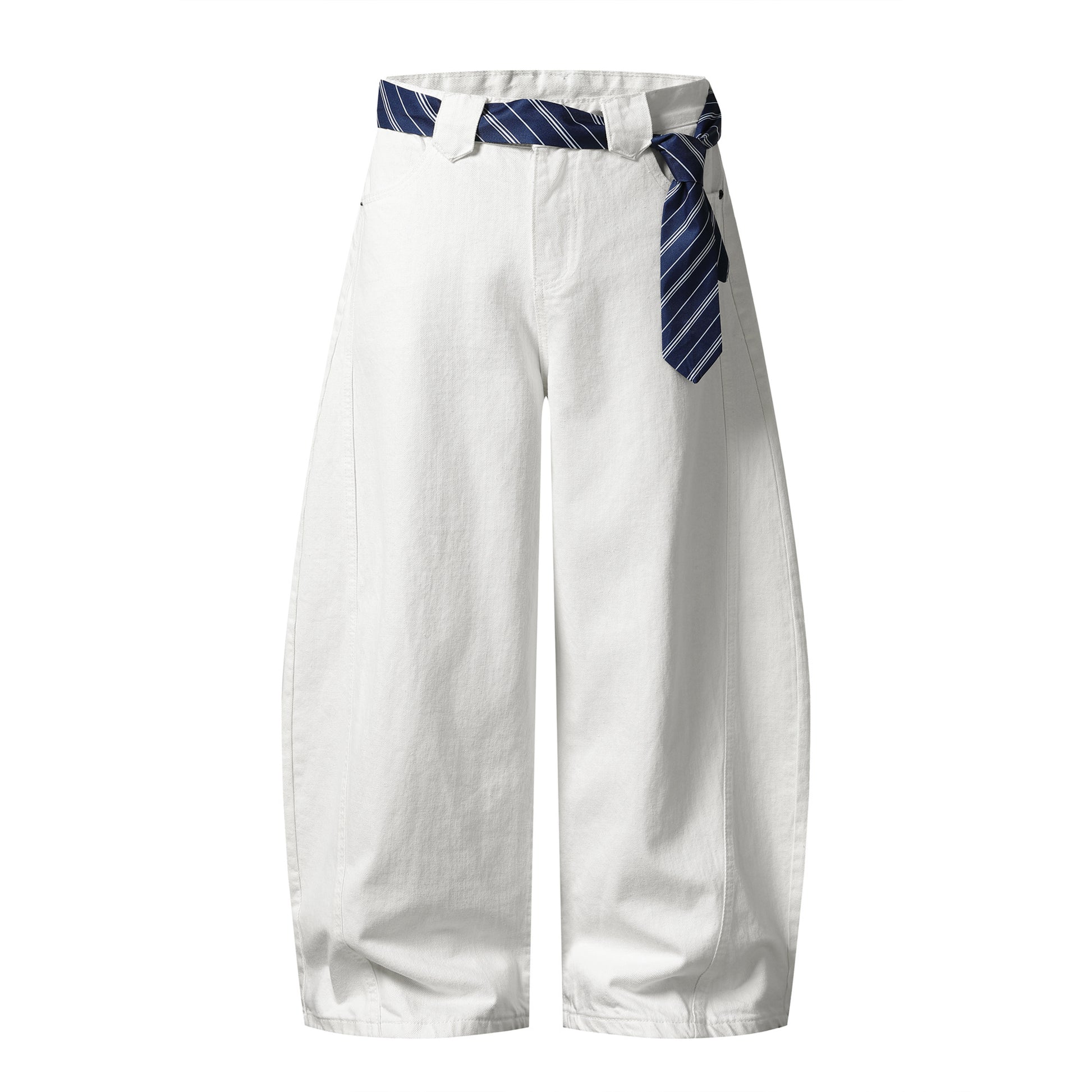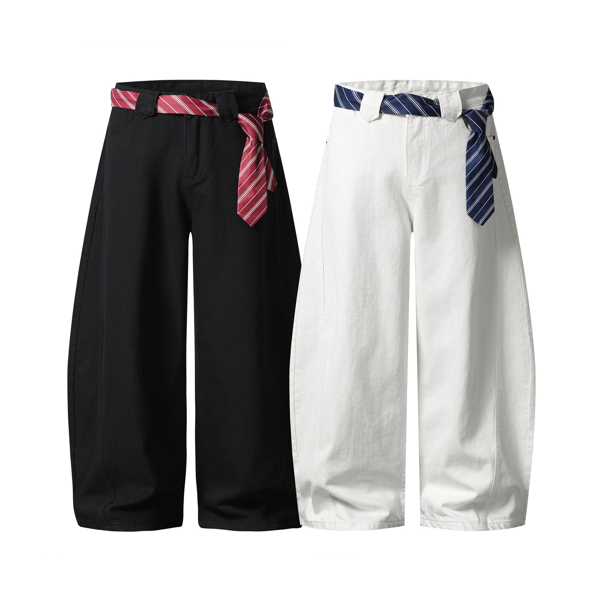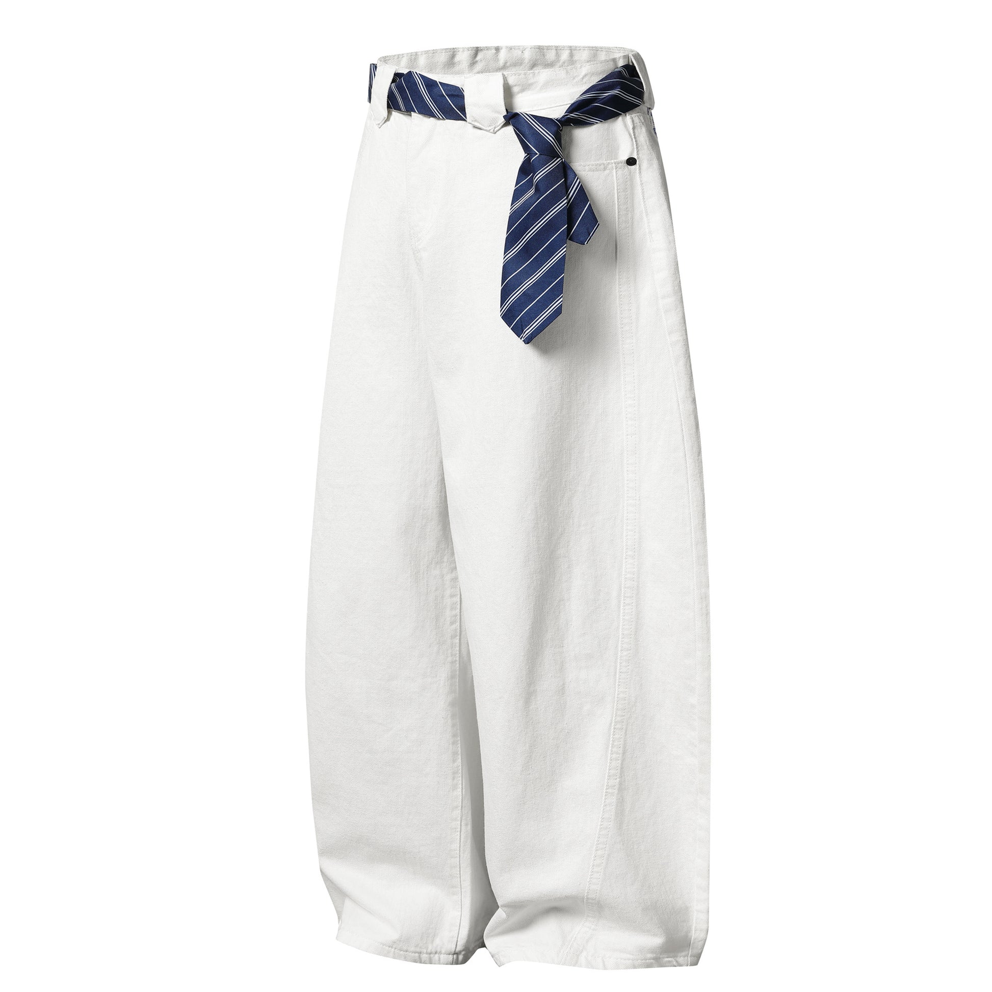 The Omirad Tie-Belt Barrel Jeans deliver a bold mix of formal and street aesthetics. Featuring a unique detachable tie belt and embroidered gothic lettering across the back, these jeans stand out with a sculpted barrel silhouette and relaxed volume. Crafted from a premium cotton blend, they combine structured texture with effortless flow — a statement piece that redefines everyday streetwear.