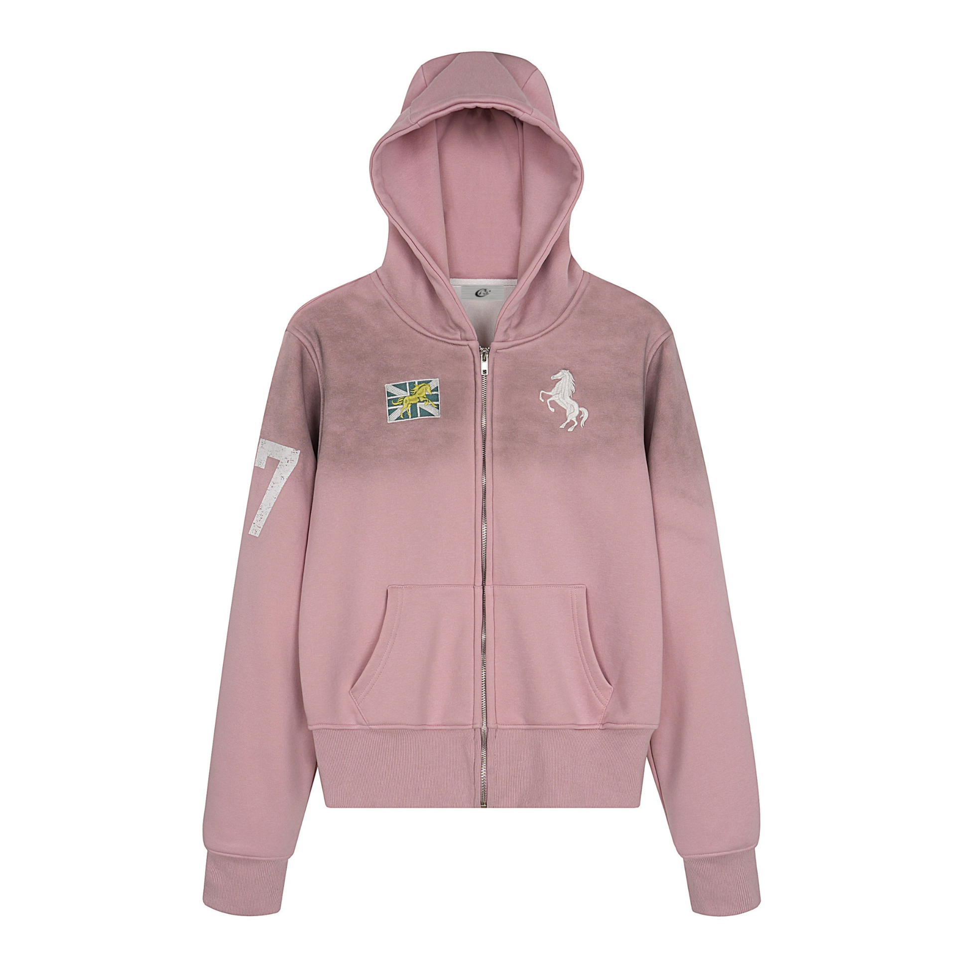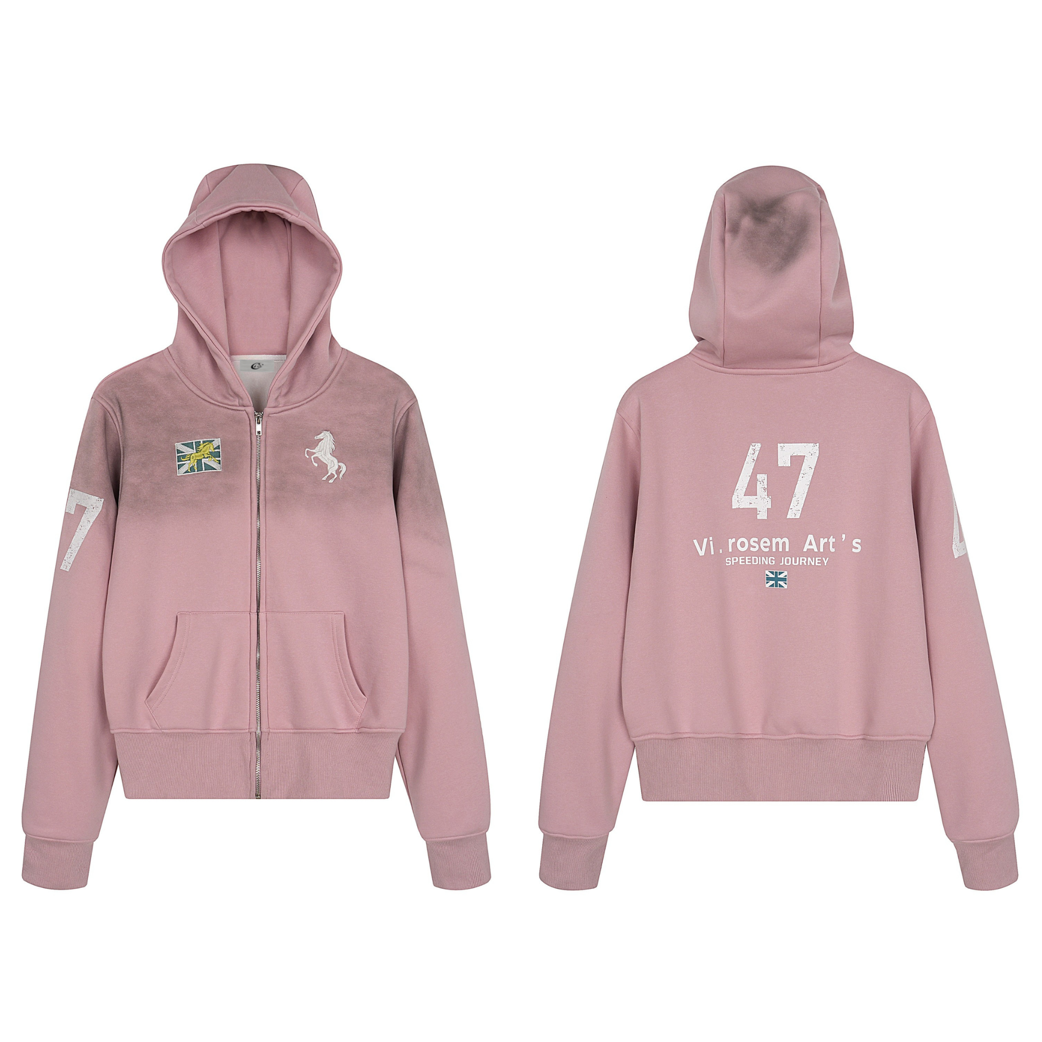 Clothing Details: Distressed gradient wash, printed racing graphics, flag patch, full-zip front, kangaroo pocket, ribbed cuffs and hem