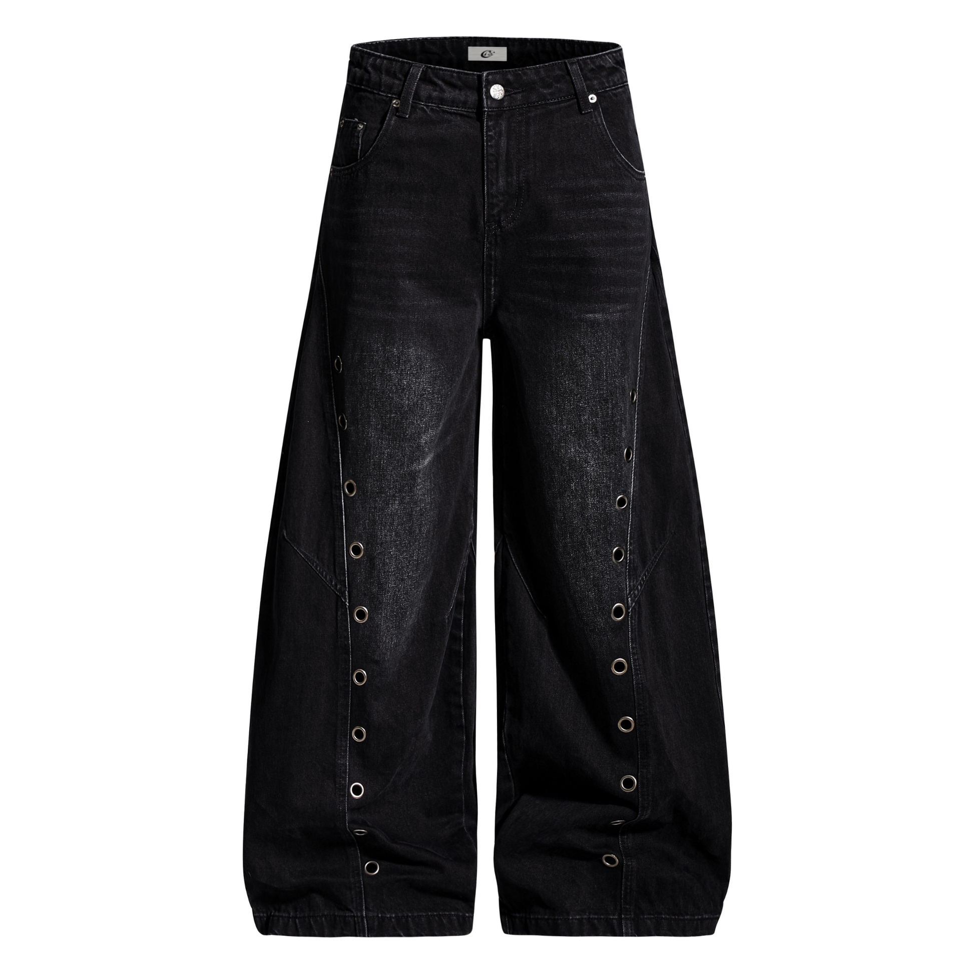 Clothing Details: Washed black denim, metal eyelet detailing along seams, barrel-leg silhouette, mid-rise waist, classic 5-pocket design, button and zip closure