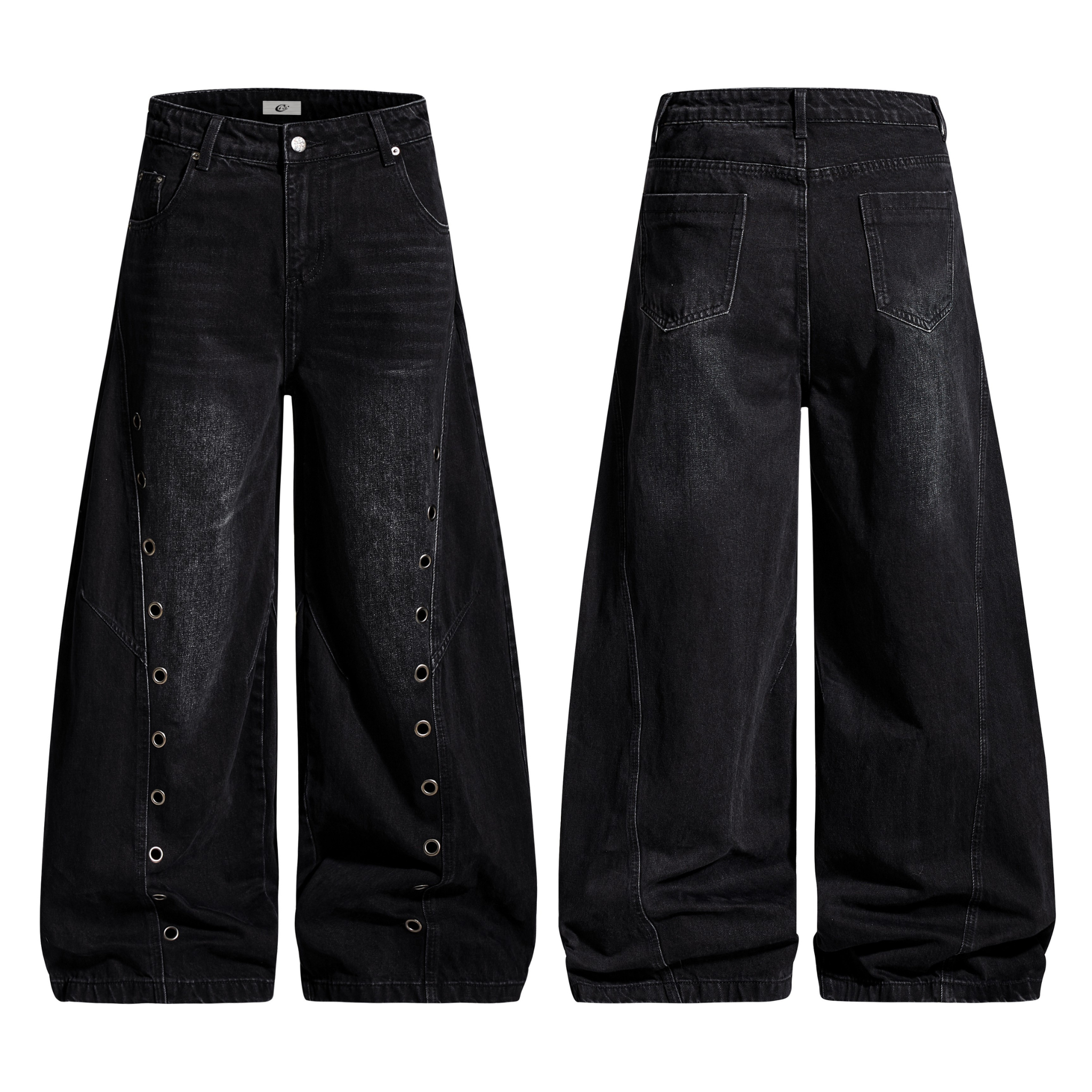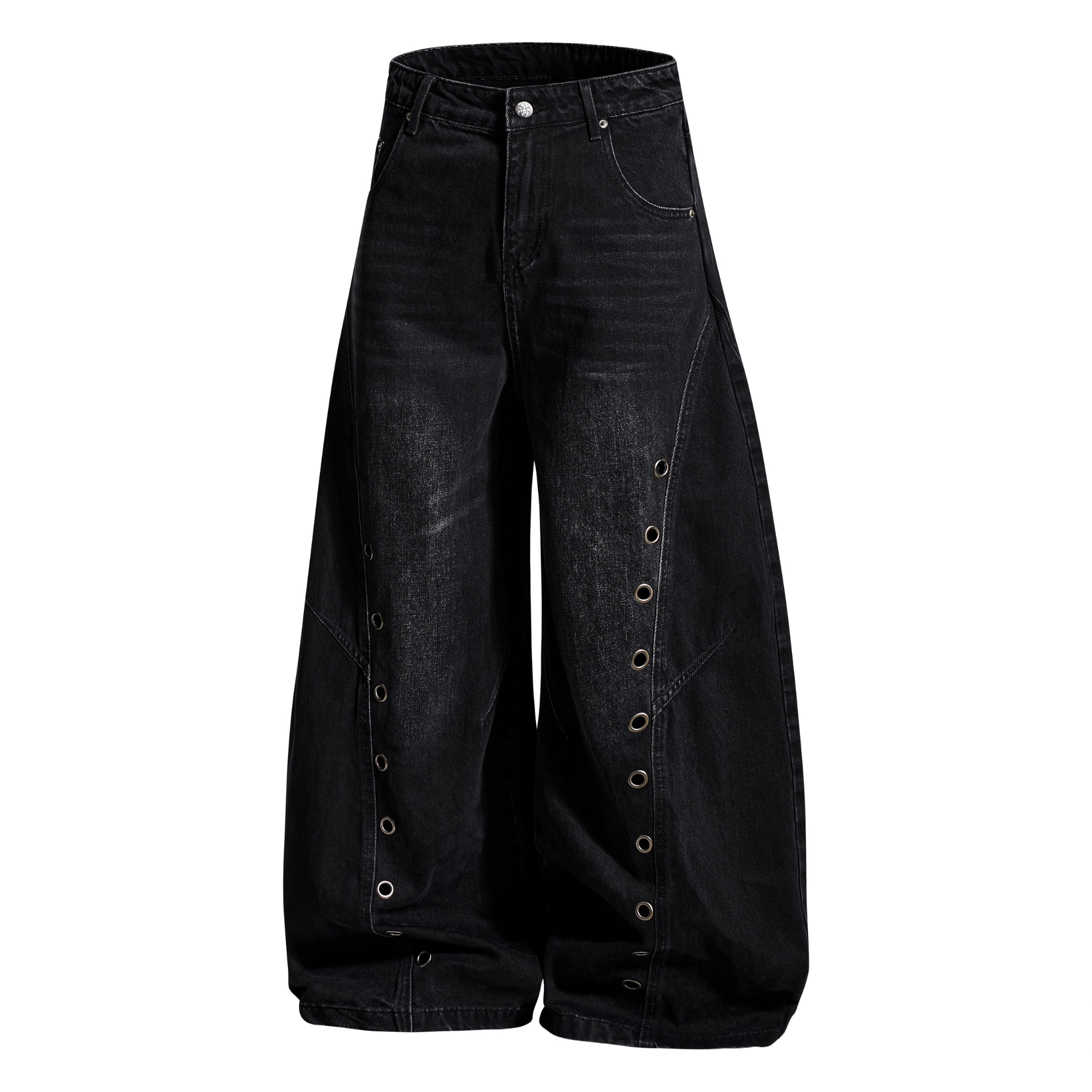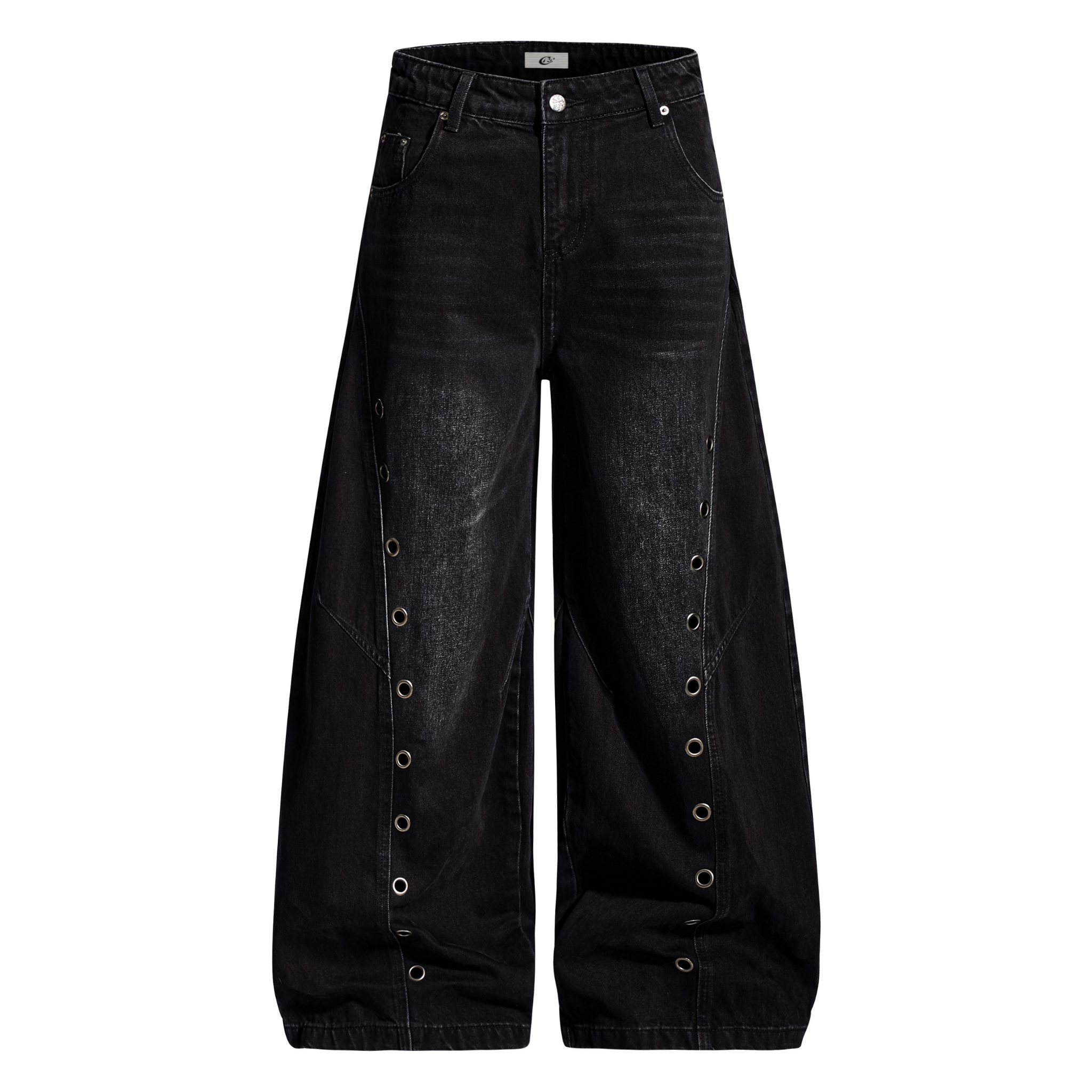 The Omirad Eyelet Barrel Denim Pants fuse industrial detailing with a bold streetwear silhouette. Made from premium cotton-blend denim, these pants feature a washed black finish accented by metallic eyelets running along the side seams — adding texture and edge to the oversized barrel cut. The structured drape and mid-rise waist deliver a clean yet powerful shape, perfect for statement street fits with a utilitarian touch.