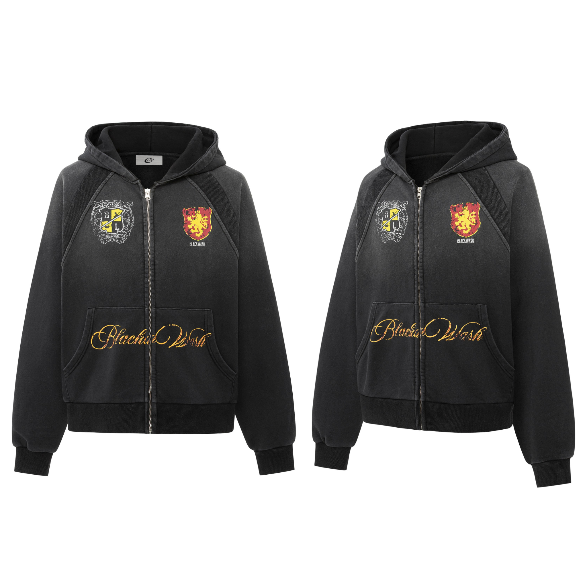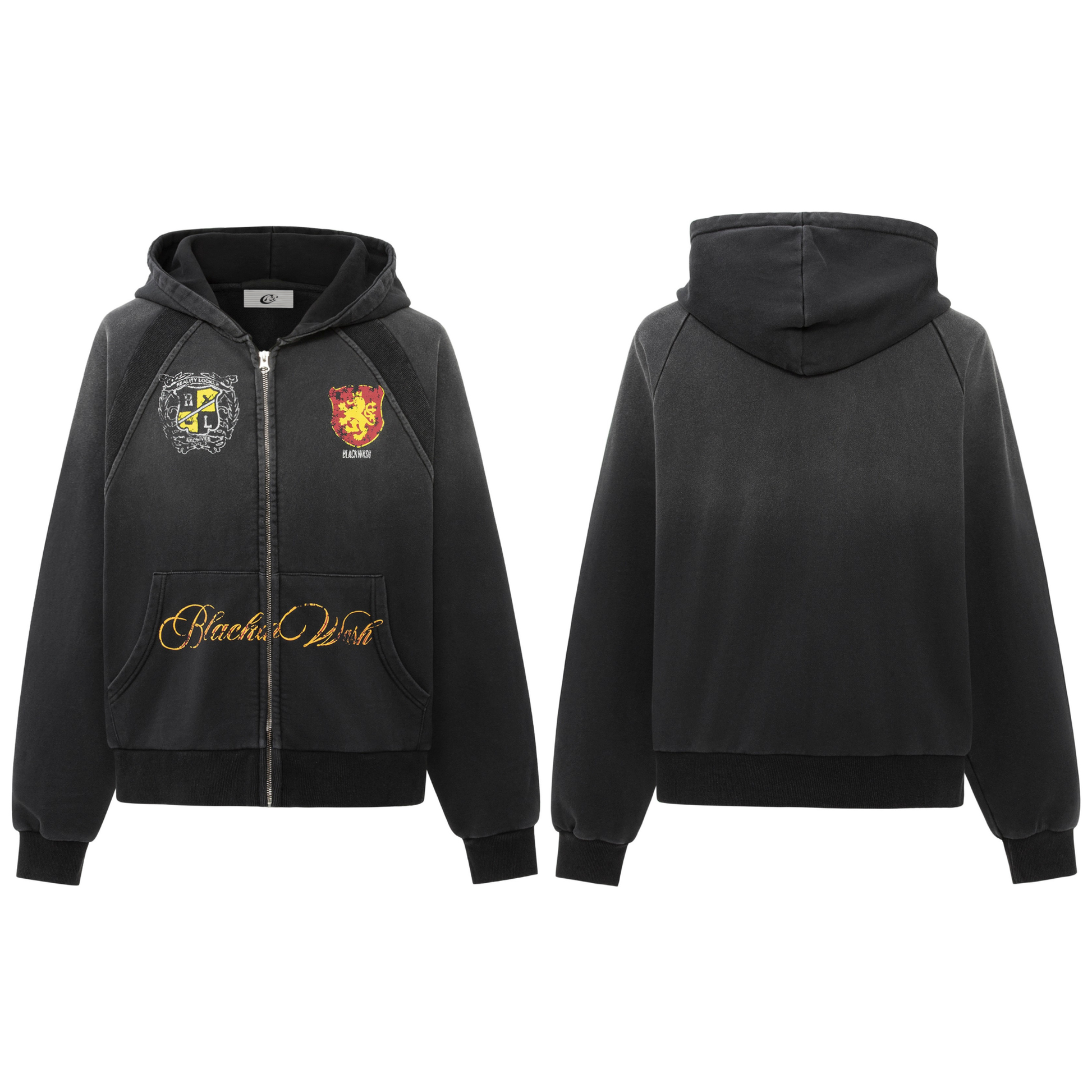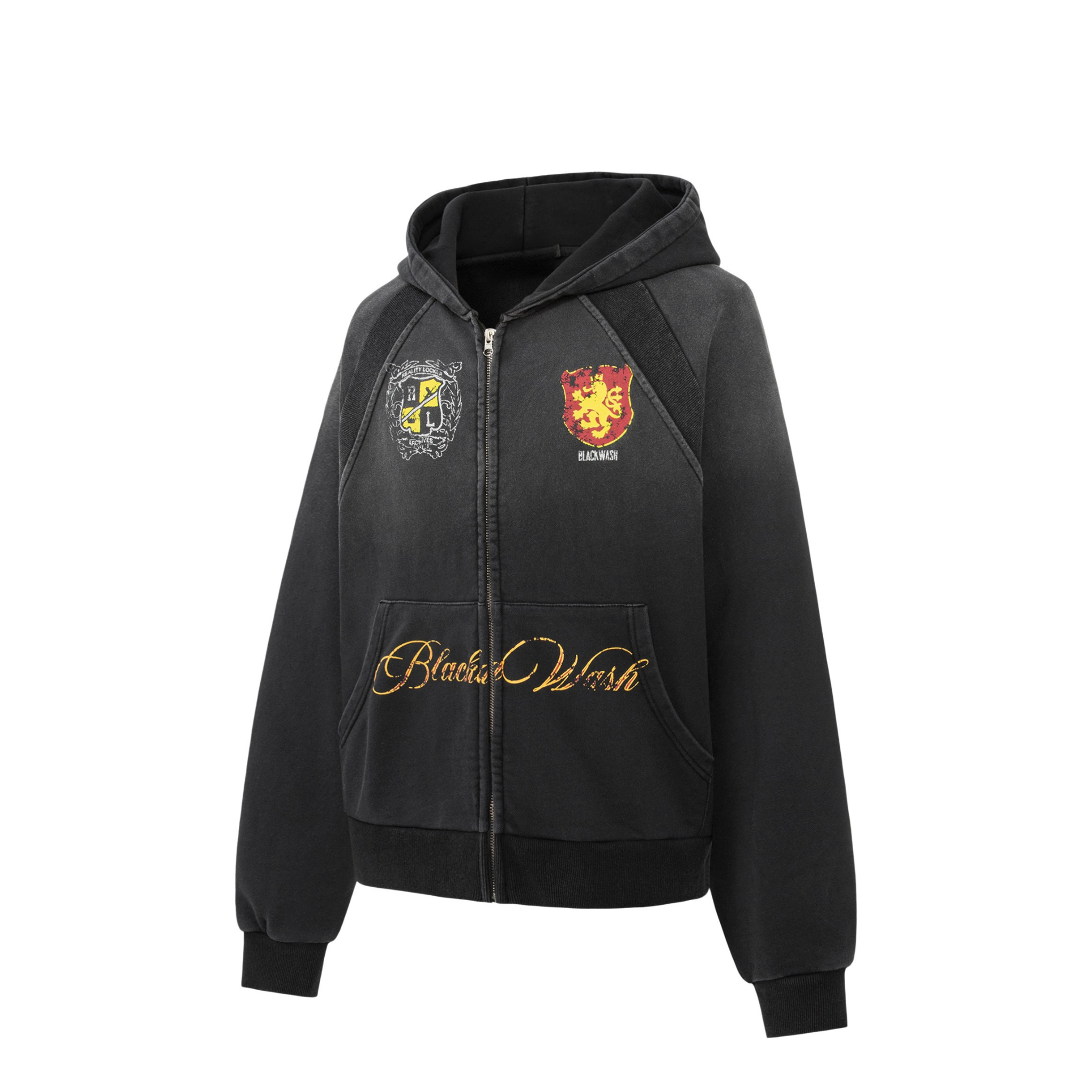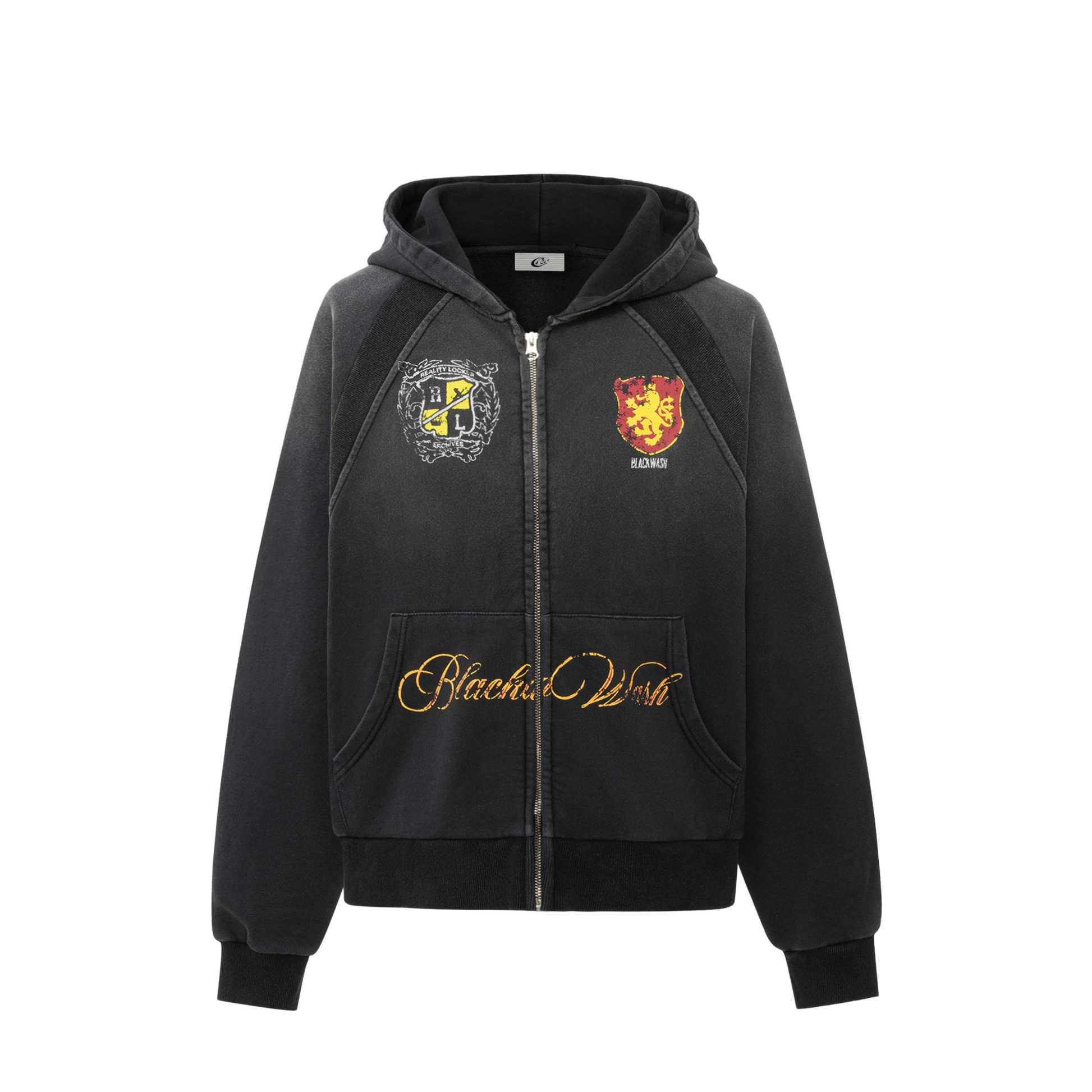 Clothing Details: Washed black finish, embroidered crest graphics, gothic pocket lettering, full-zip front, kangaroo pocket, ribbed cuffs and hem