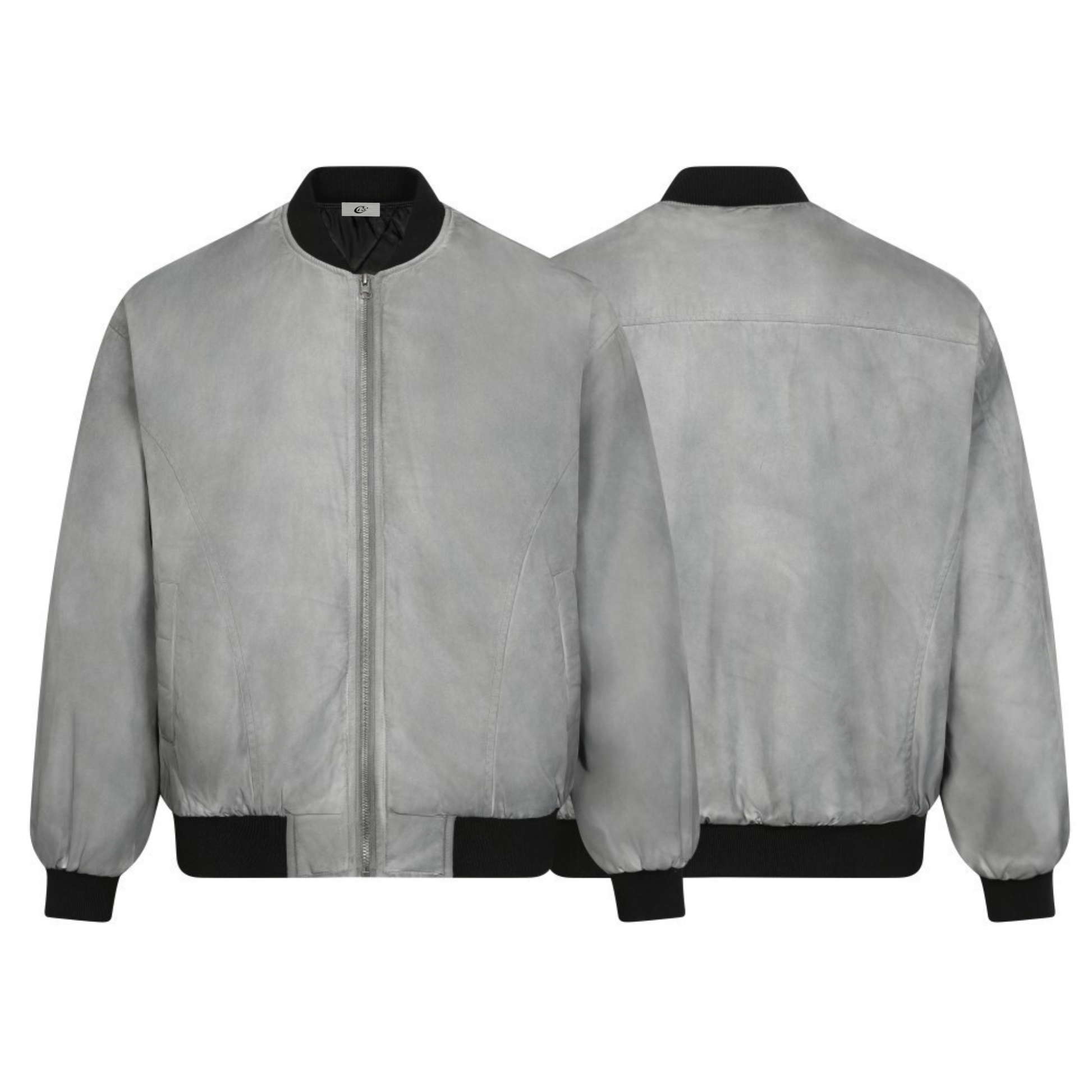 The Omirad Washed Grey Bomber Jacket fuses minimalism with street-ready texture. Made from high-density polyester, the fabric features a subtle washed finish that gives it a soft matte look with depth and character. The ribbed collar, cuffs, and hem contrast against the smooth body, offering both structure and comfort — ideal for transitional weather or urban layering.