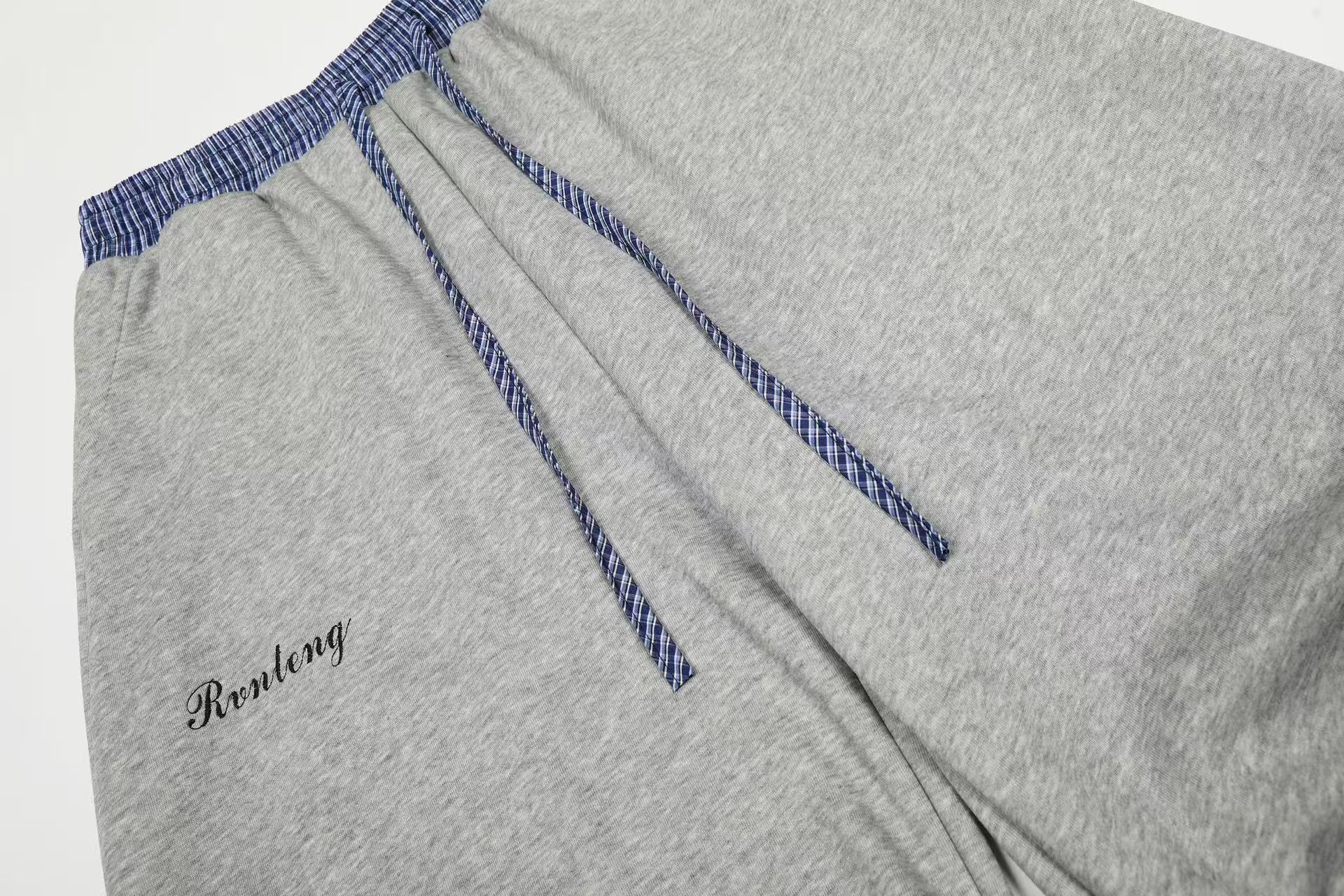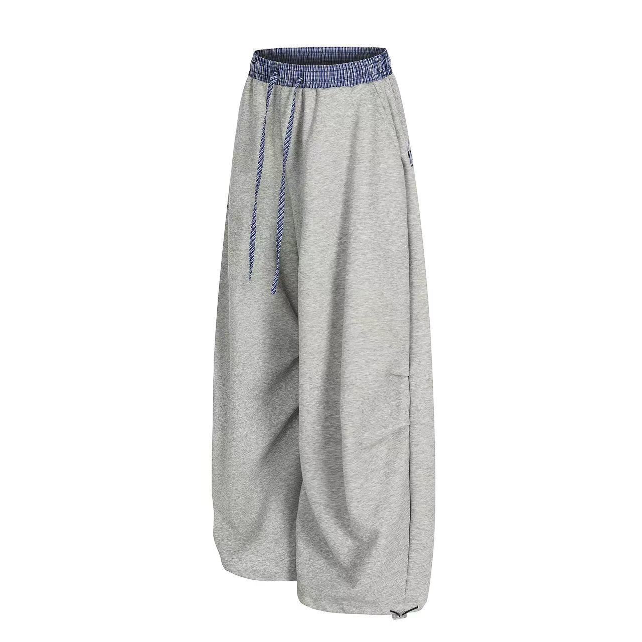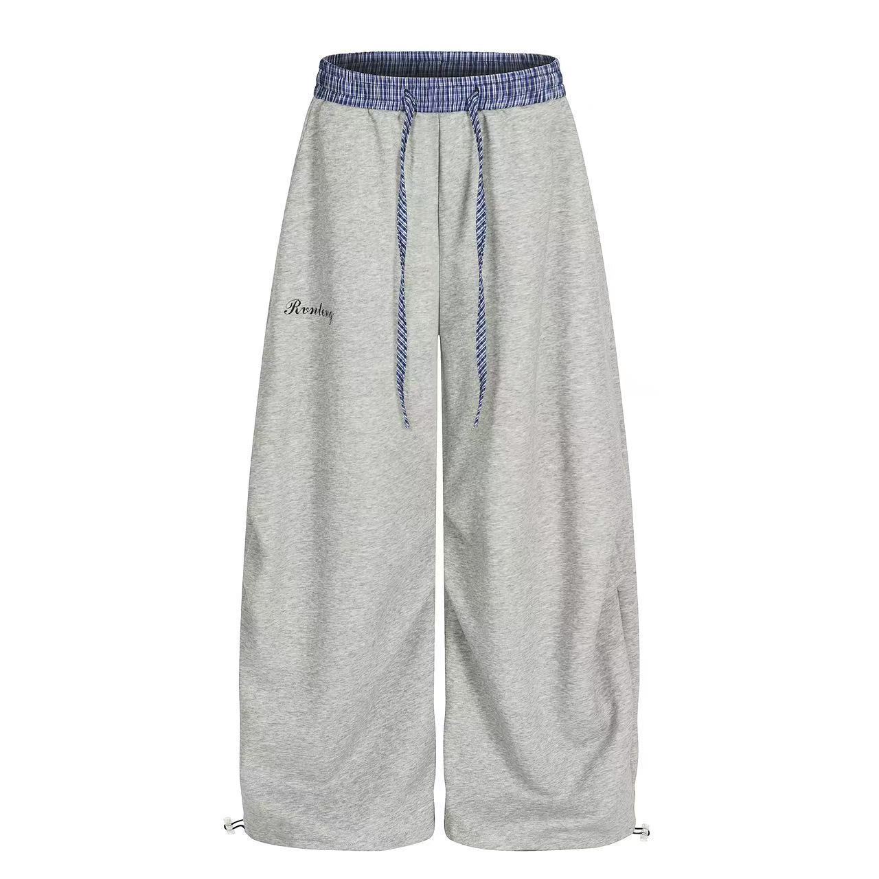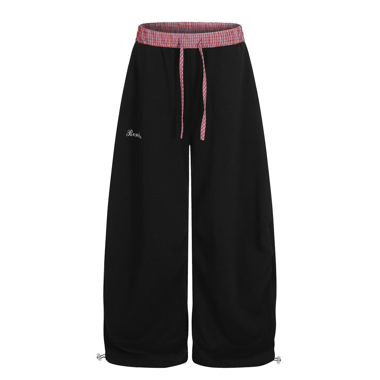 Clothing details: Plaid waistband, drawstring closure, embroidered graphics, adjustable hem, oversized fit.