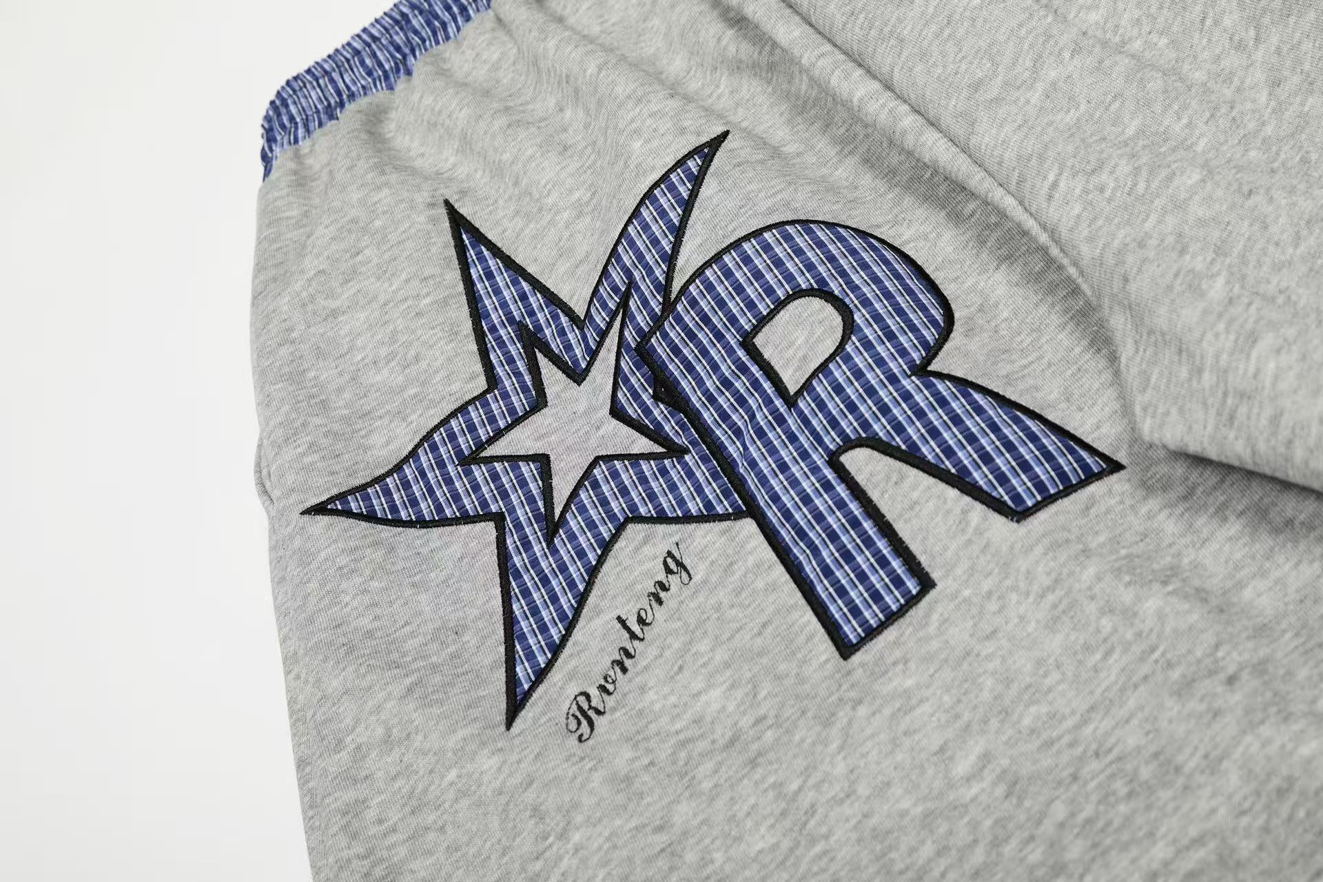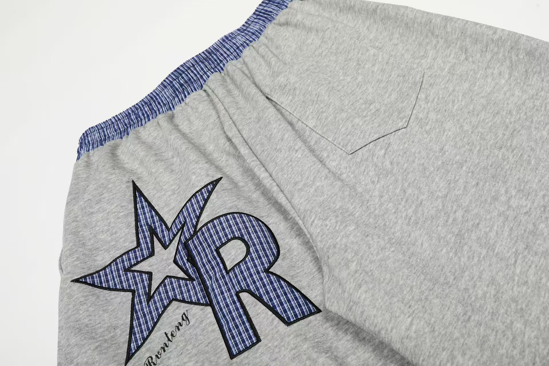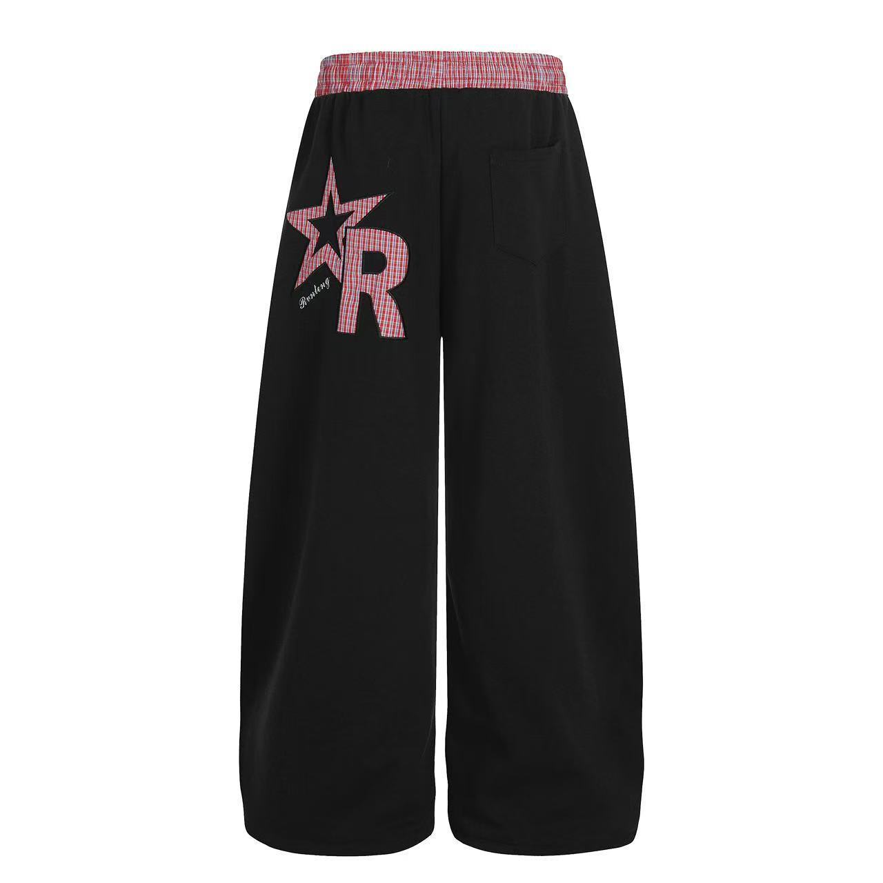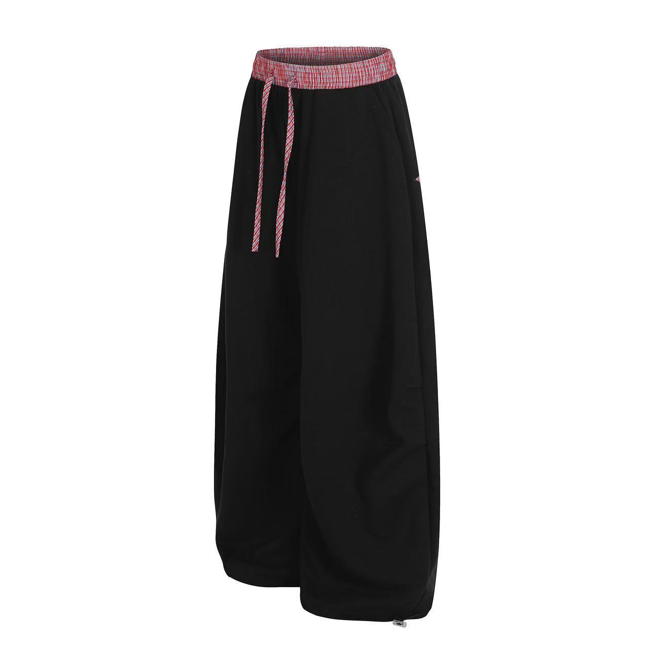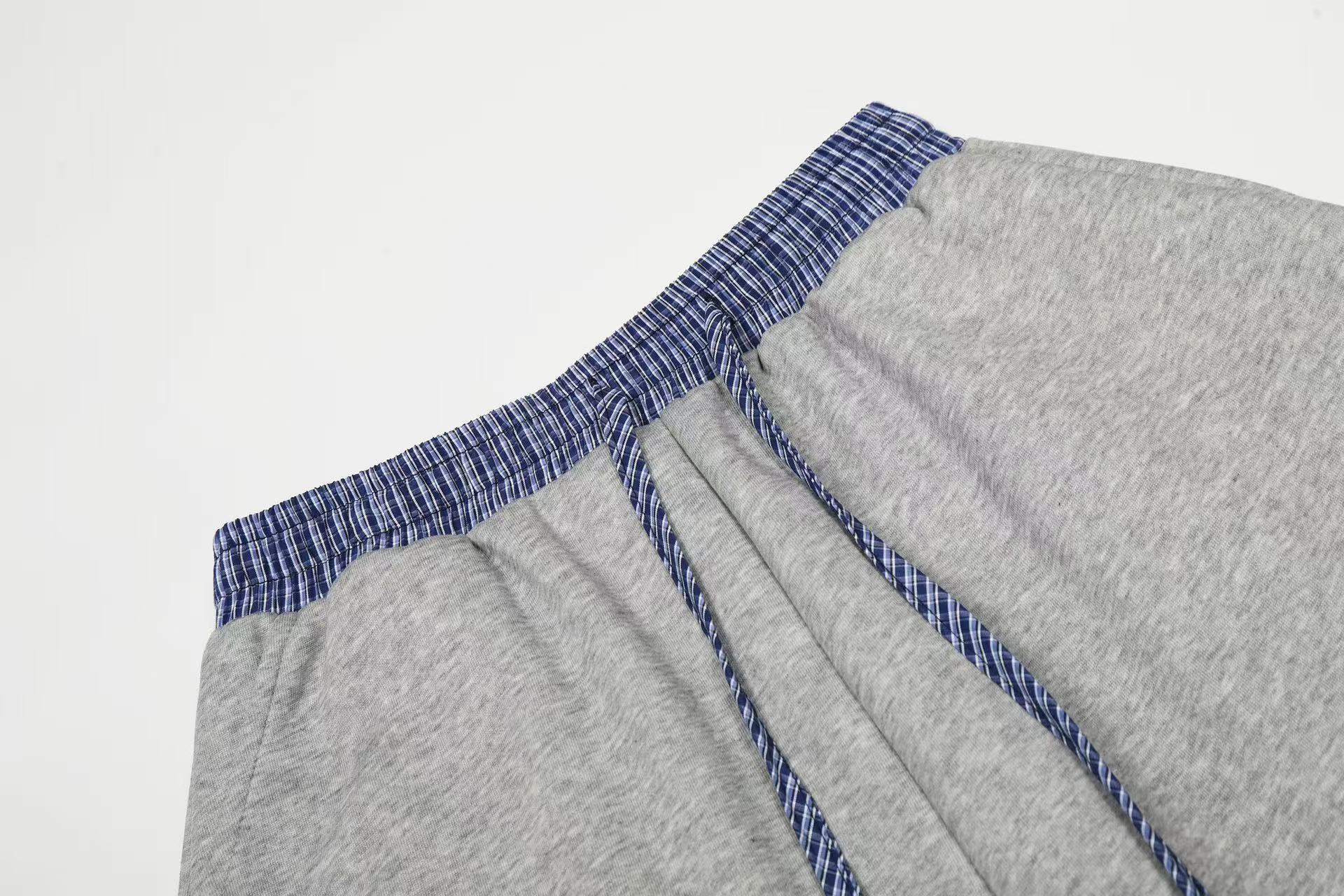 Clothing details: Plaid waistband, drawstring closure, embroidered graphics, adjustable hem, oversized fit.