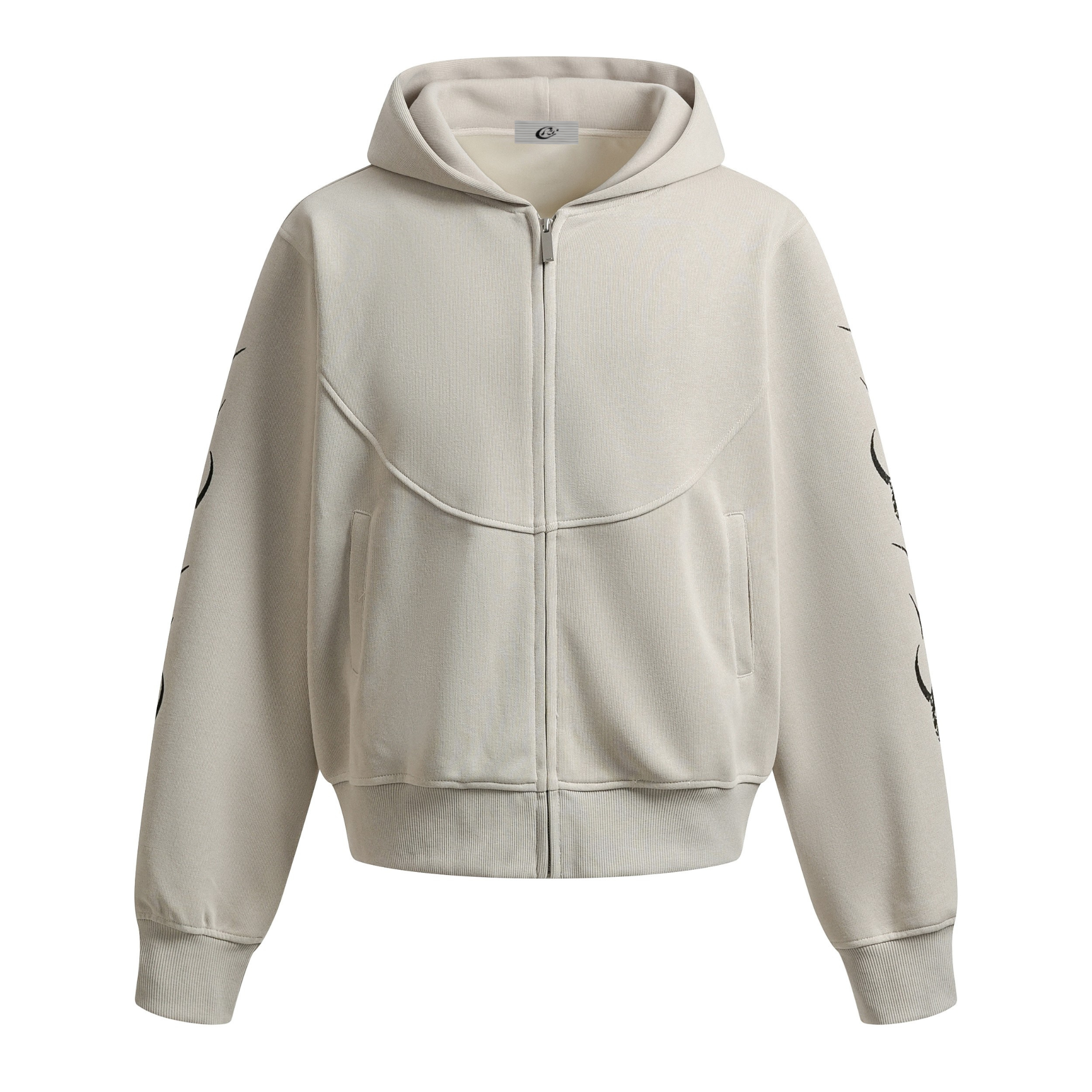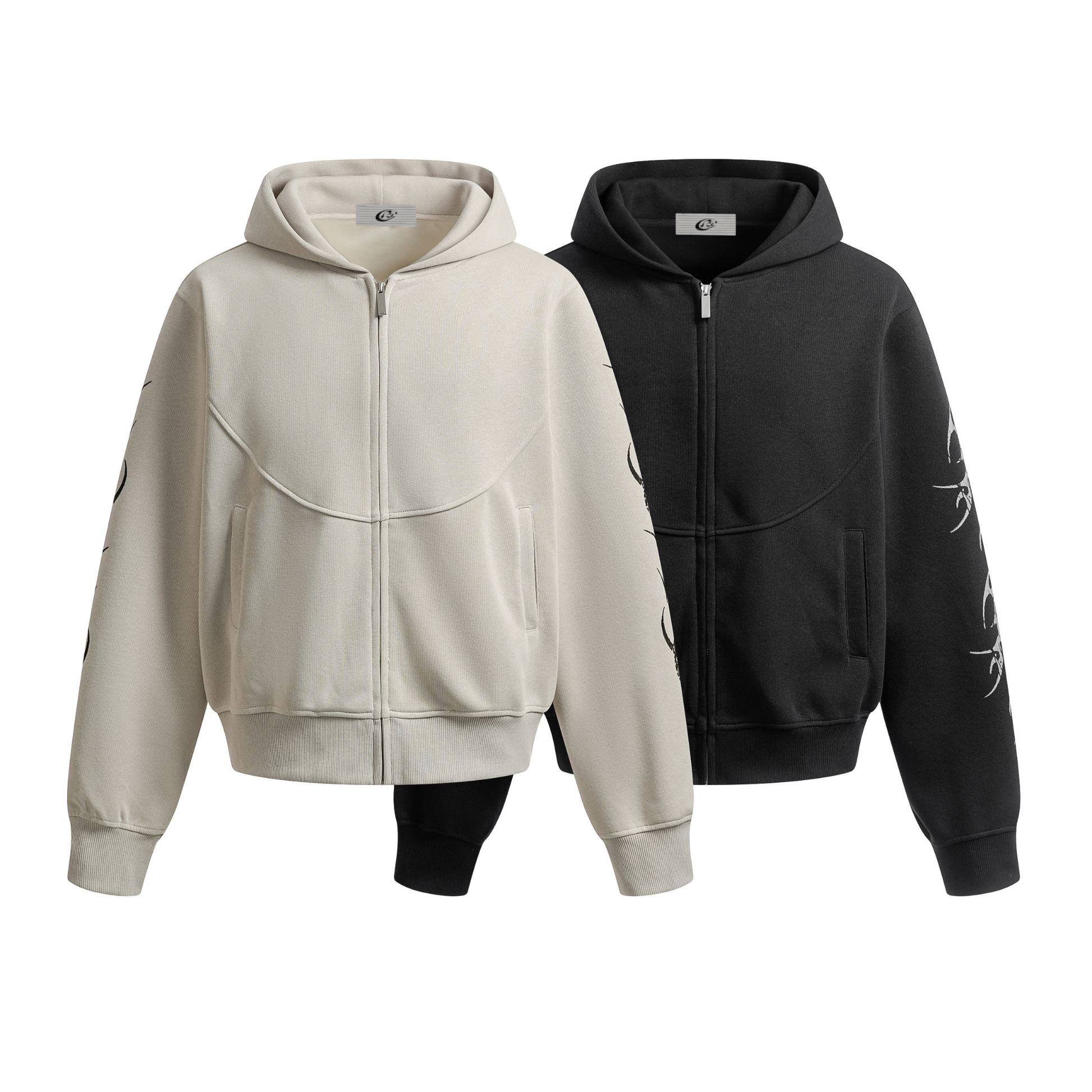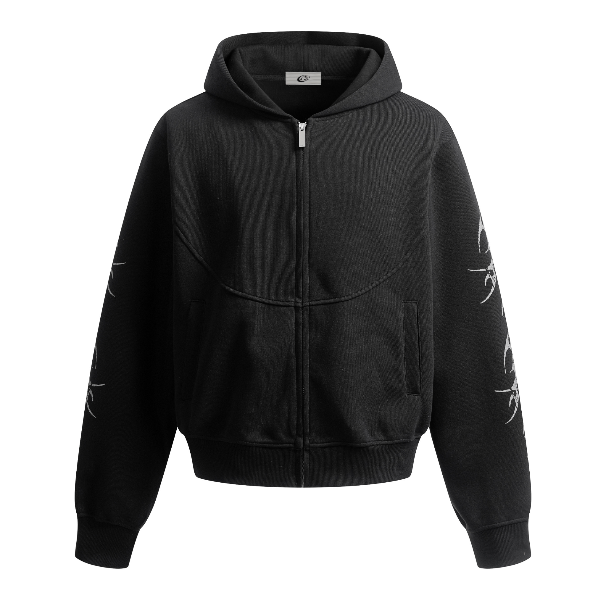 The Omirad Tribal Curve Zip Hoodie combines minimalist structure with bold graphic energy. Crafted from a premium cotton-poly blend, it features an arched seam design across the chest that enhances its sculpted silhouette. The sleeves are detailed with tribal flame prints, adding a striking Y2K-inspired edge to the clean base. With its soft yet structured fabric, front pockets, and smooth zipper closure, this hoodie perfectly balances comfort and statement streetwear aesthetics.