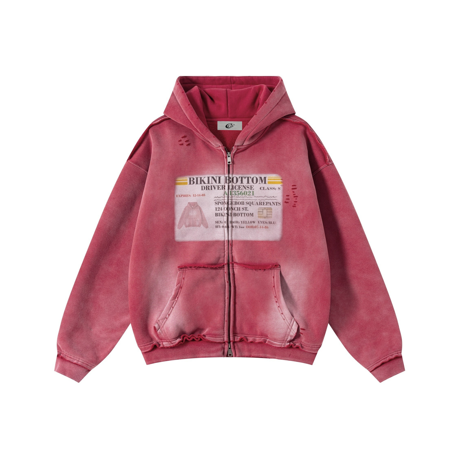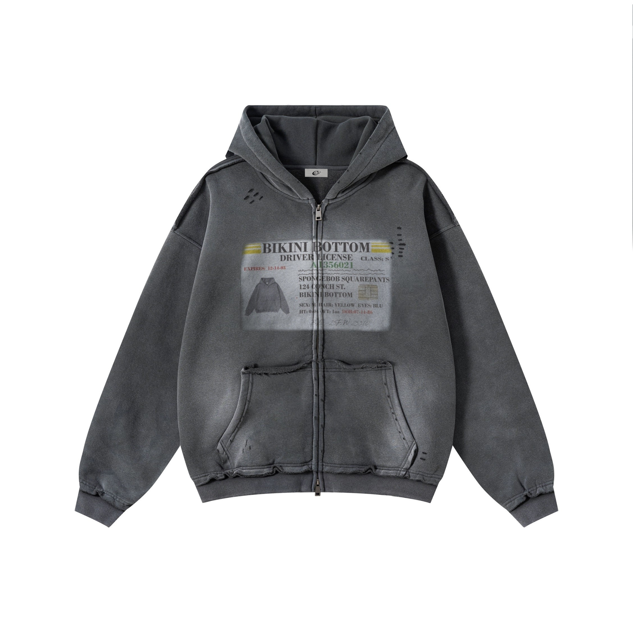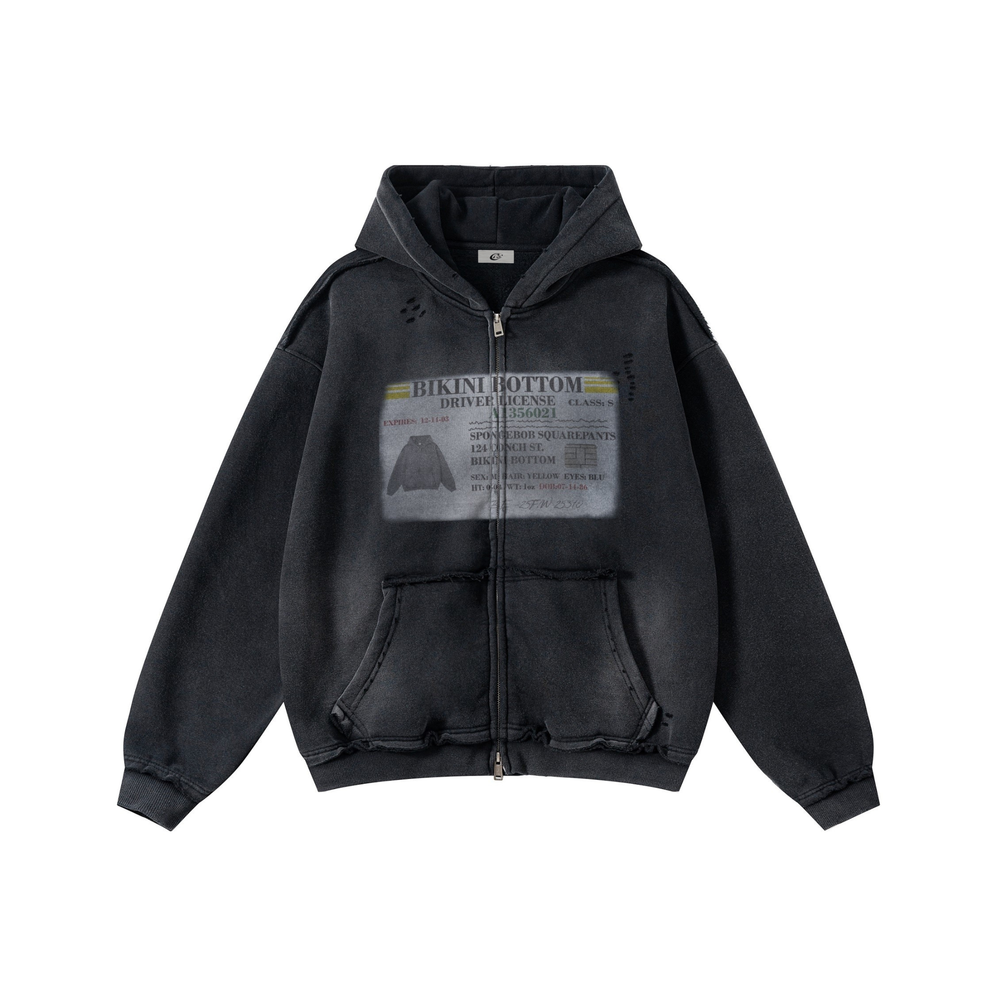 The Omirad Vintage Wash Graphic Zip Hoodie blends retro street aesthetics with a distressed finish for an authentic worn-in vibe. Featuring a bold “BIKINI BOTTOM DRIVER LICENSE” graphic print across the chest and deliberate abrasion details on the shoulder, this hoodie captures the spirit of vintage rebellion. Made from a soft cotton-poly blend with a roomy cut, it offers both comfort and character — a standout layering piece for expressive streetwear fits.