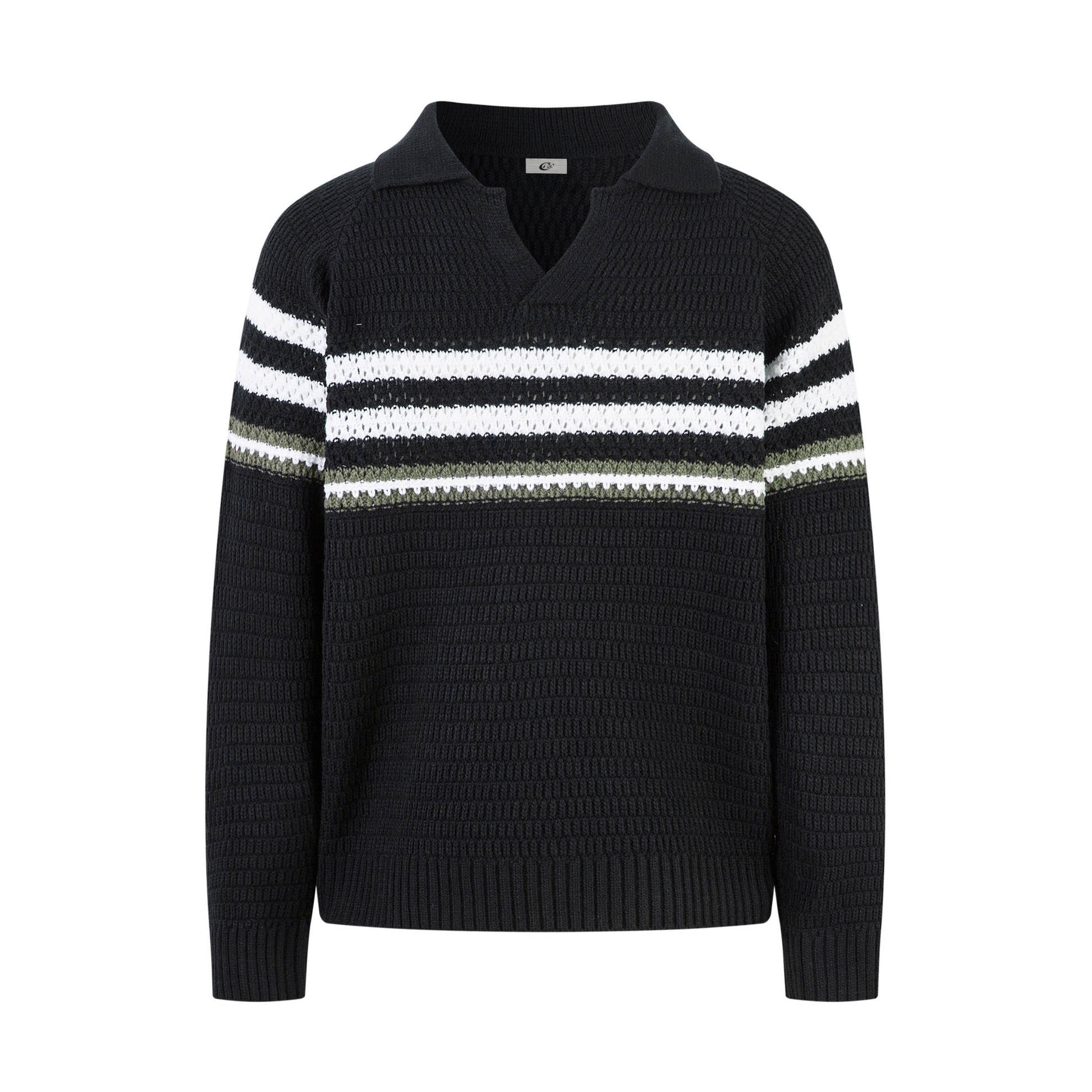 The Omirad Striped Knit Polo Sweater features a textured knit body with bold horizontal stripe accents and a relaxed polo collar for a clean, sporty streetwear vibe. Made from 100% acrylic, it delivers soft comfort and everyday versatility.