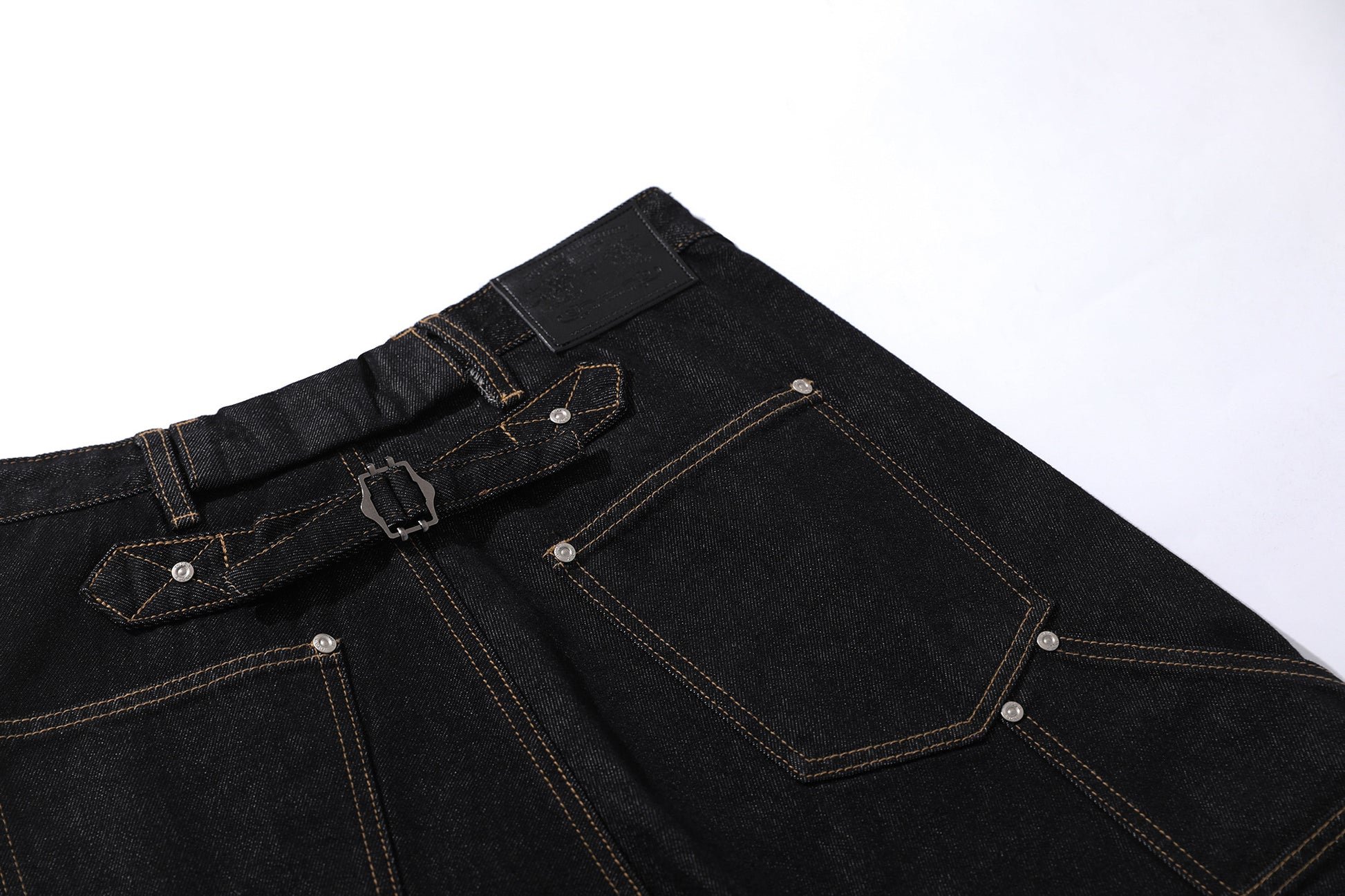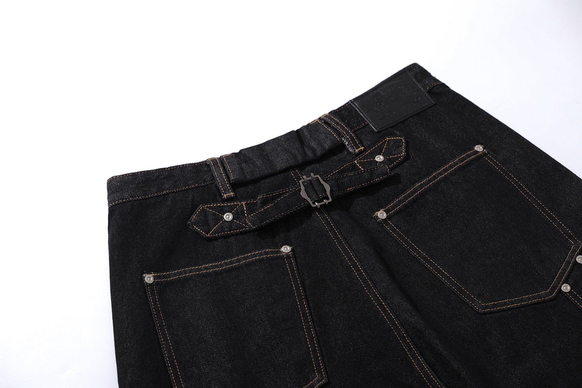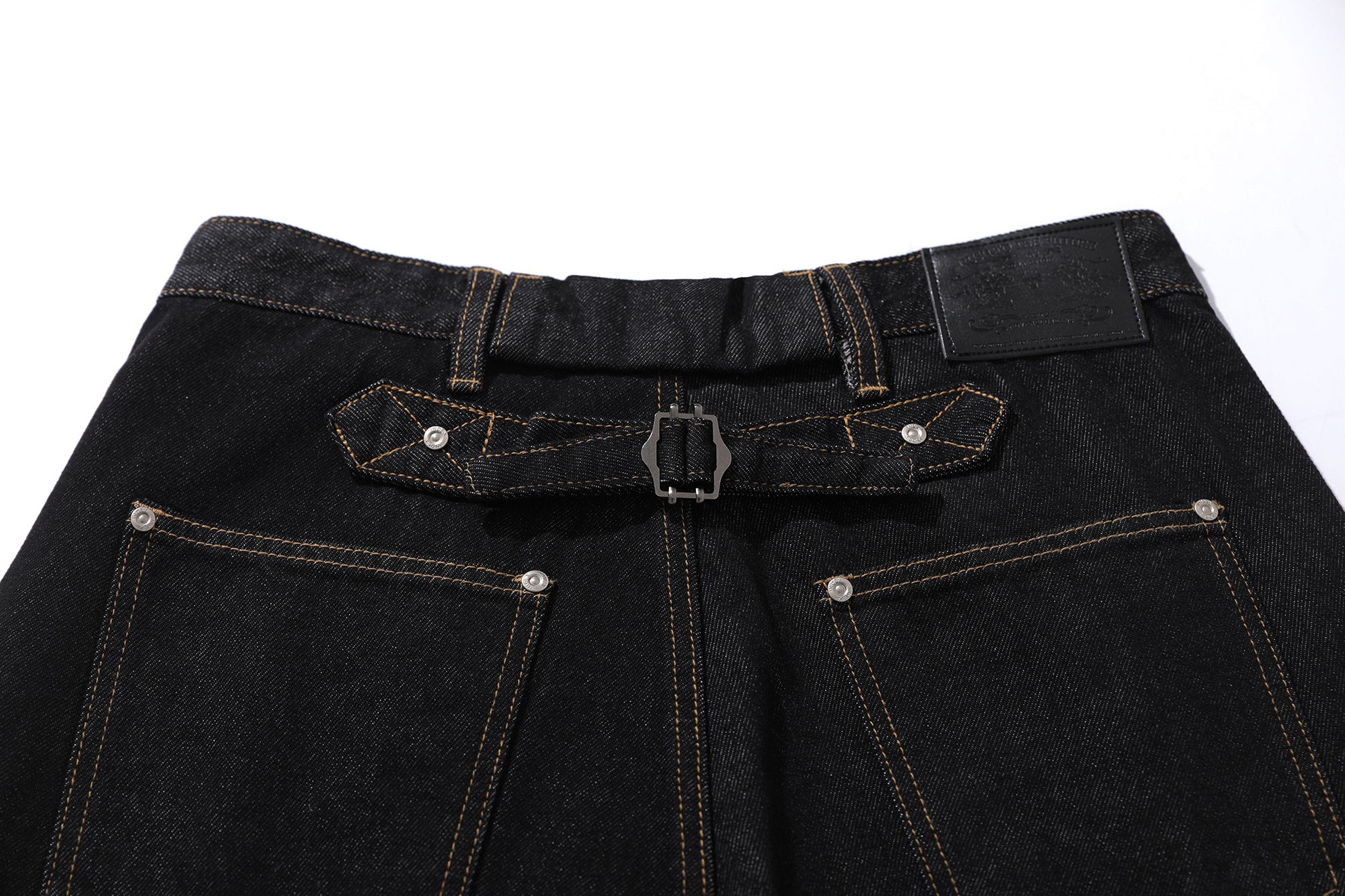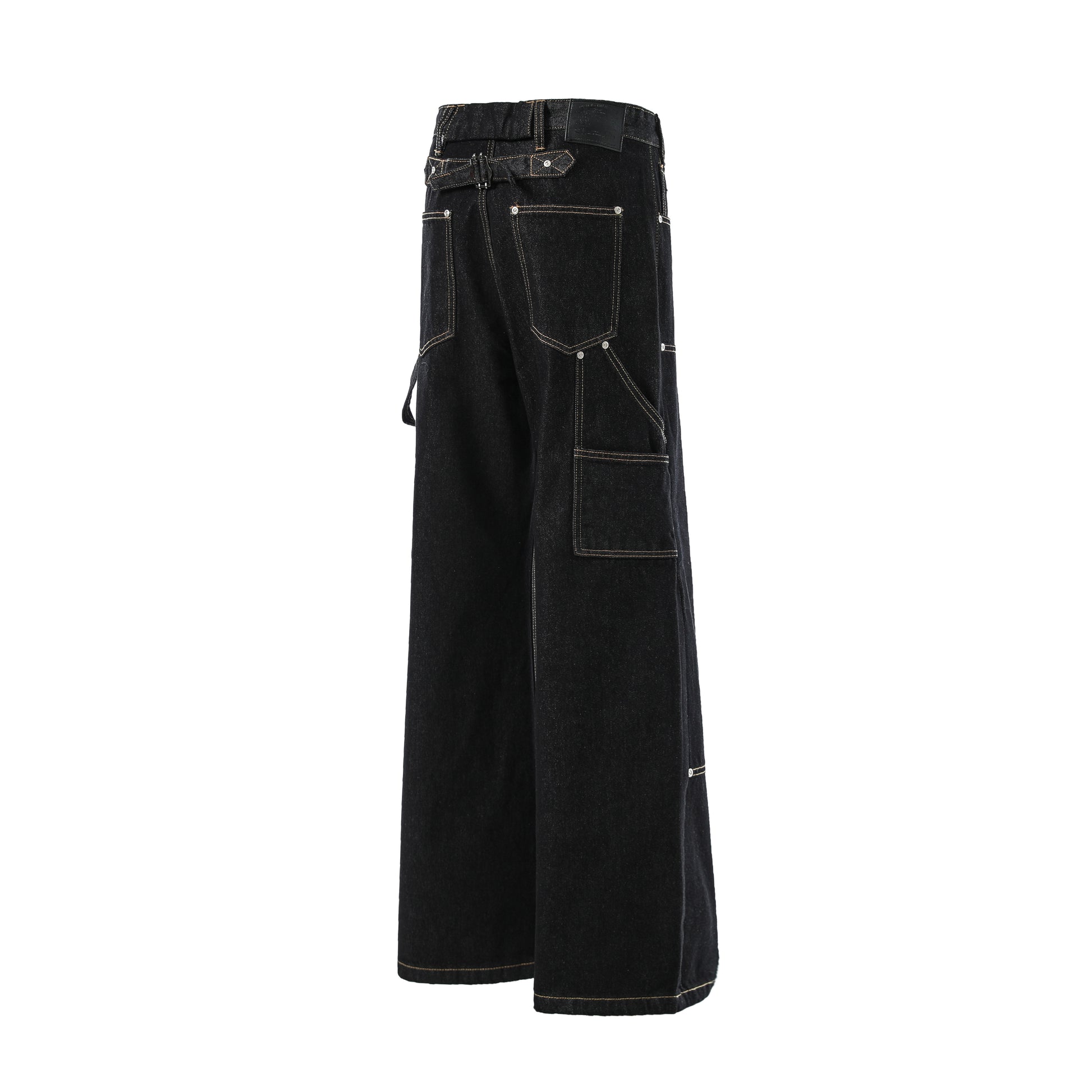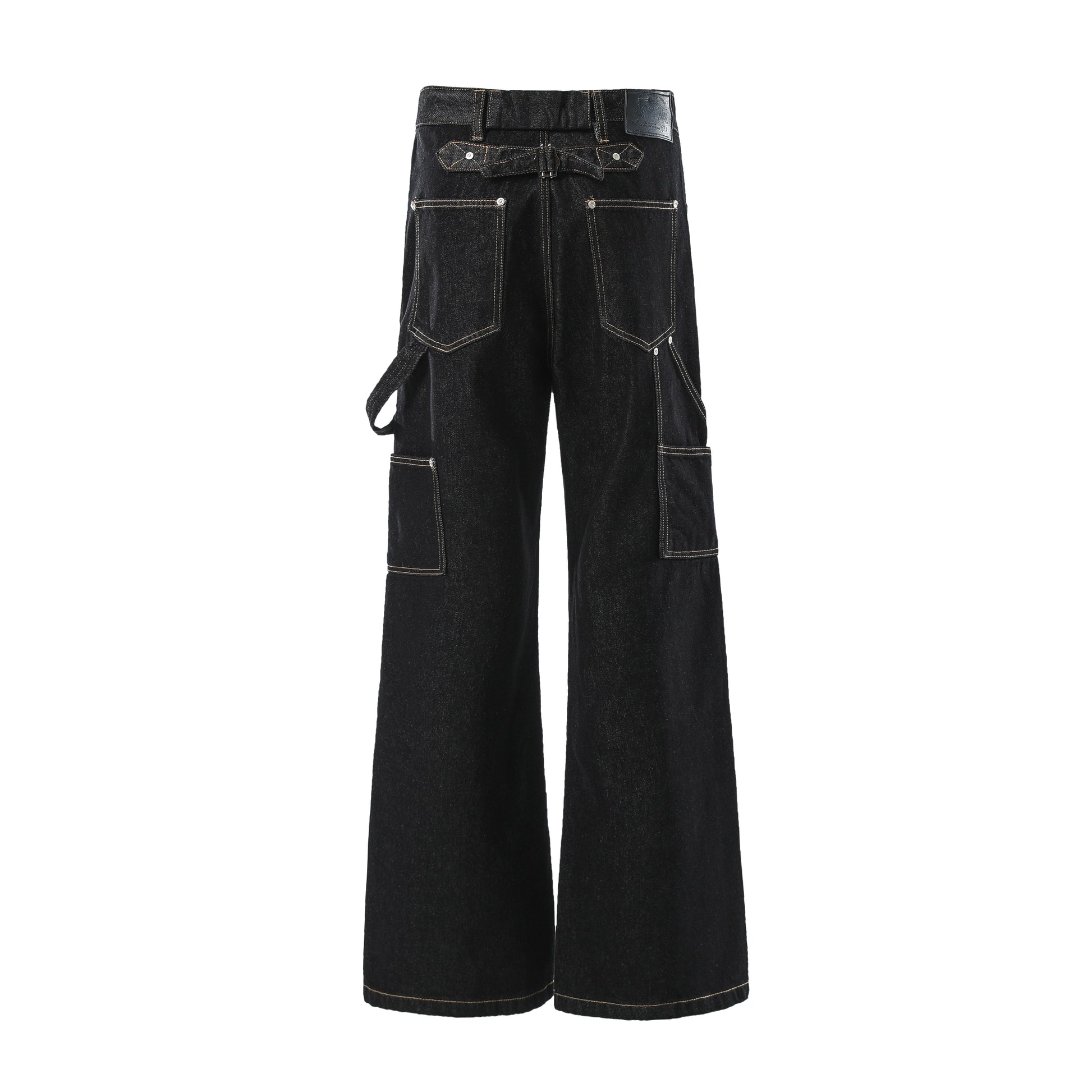 Clothing details: Wide-leg cut, exposed button fly, multi-pocket layout, contrast stitching, back strap detail, and Omirad signature leather patch.