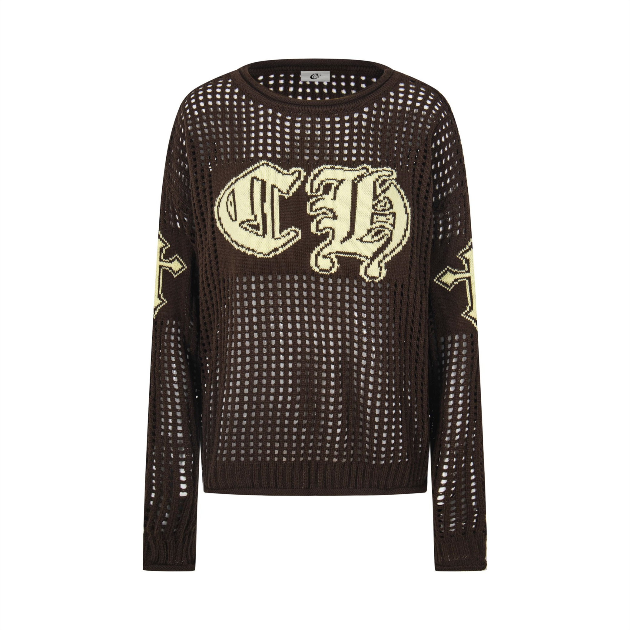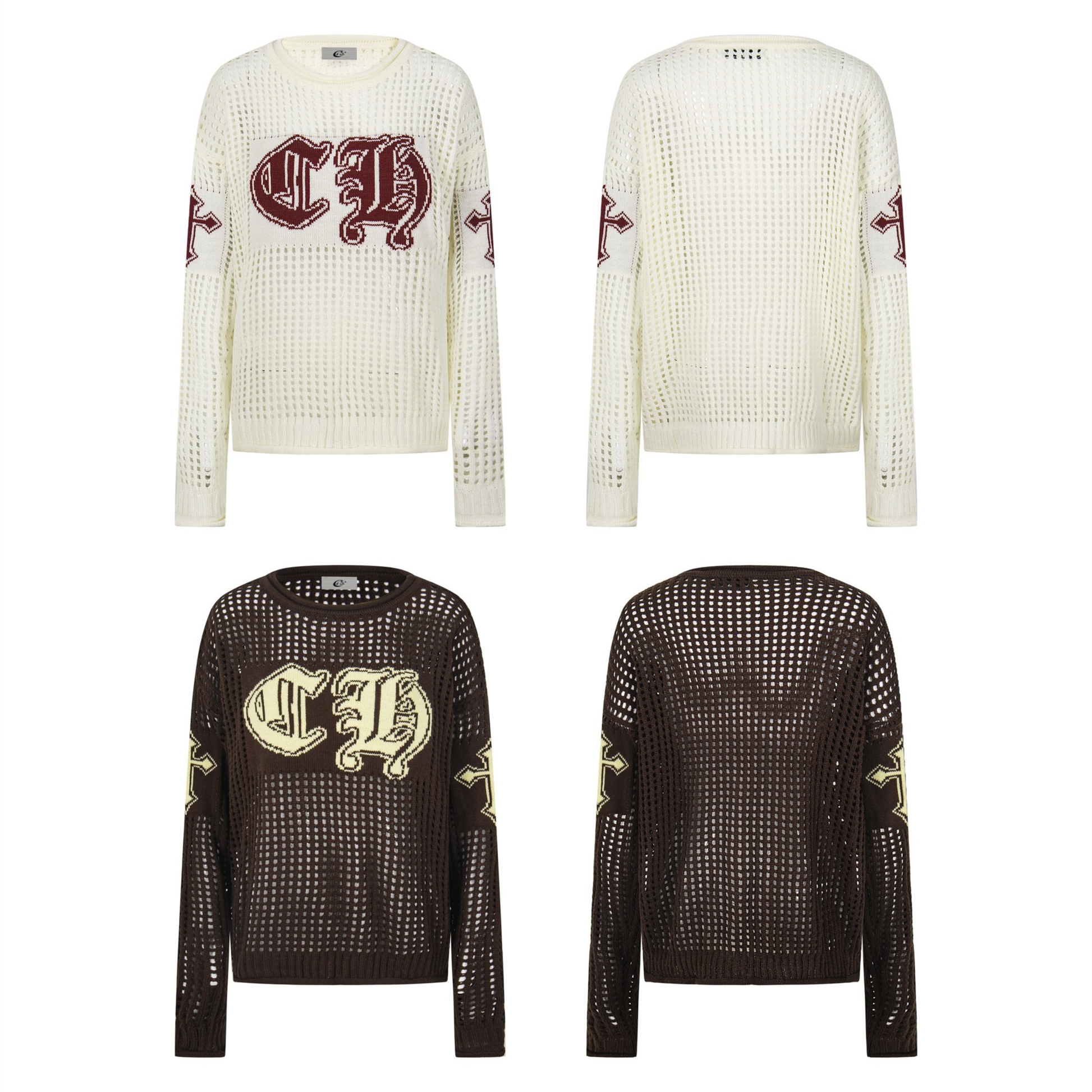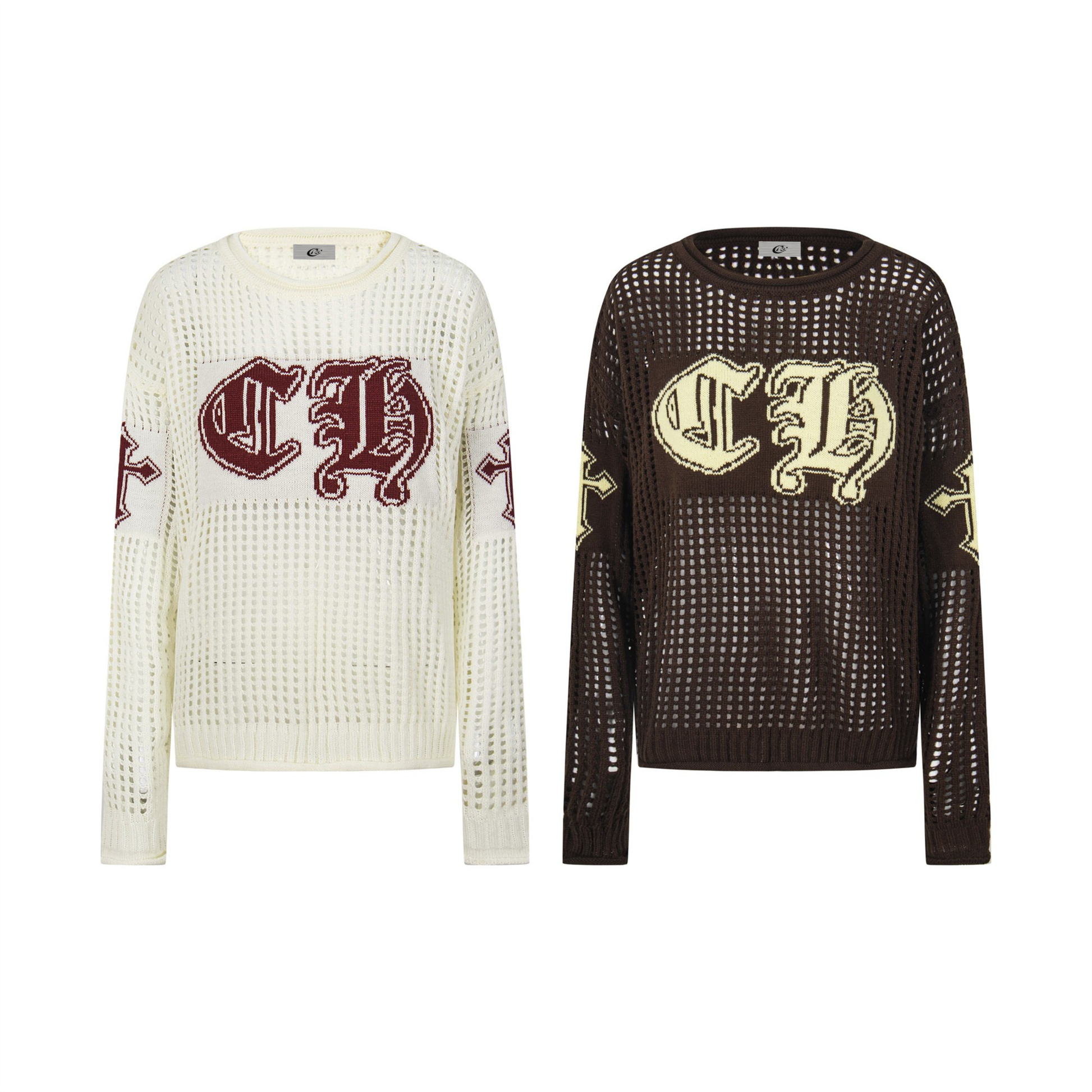 Clothing details: Open-knit texture, varsity-style CH embroidery, relaxed silhouette, ribbed cuffs and hem