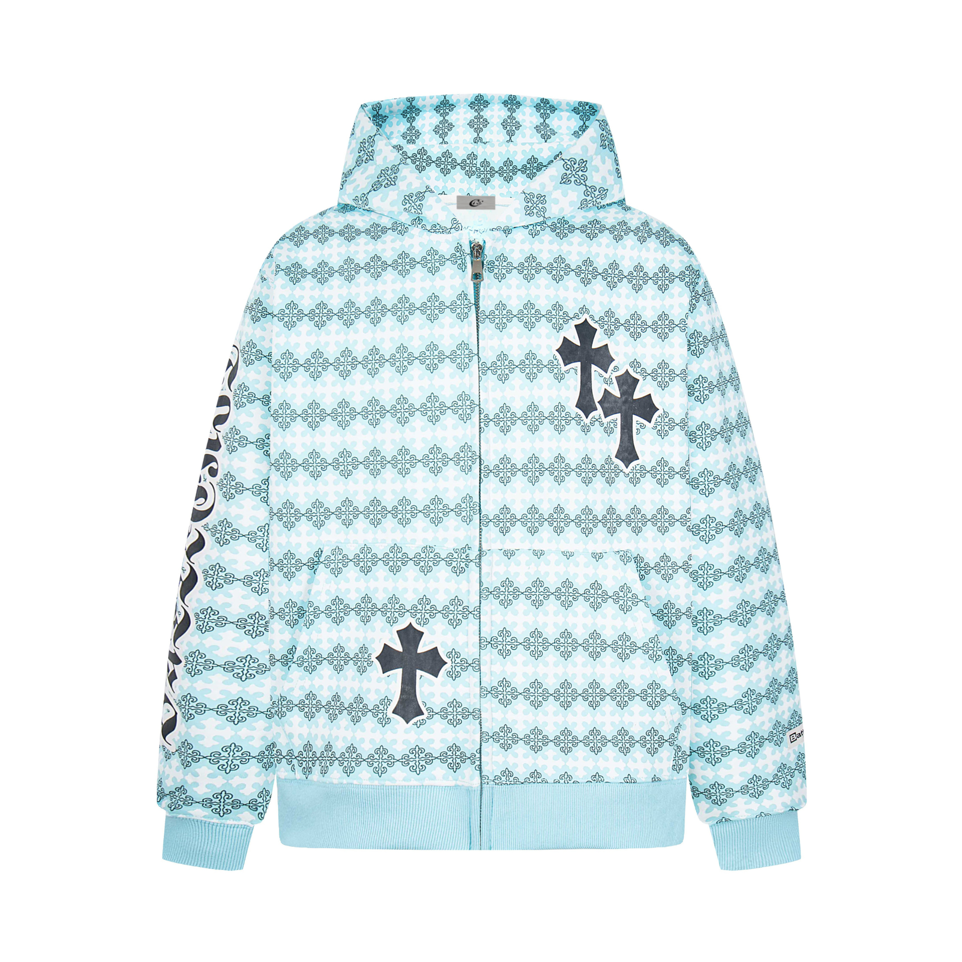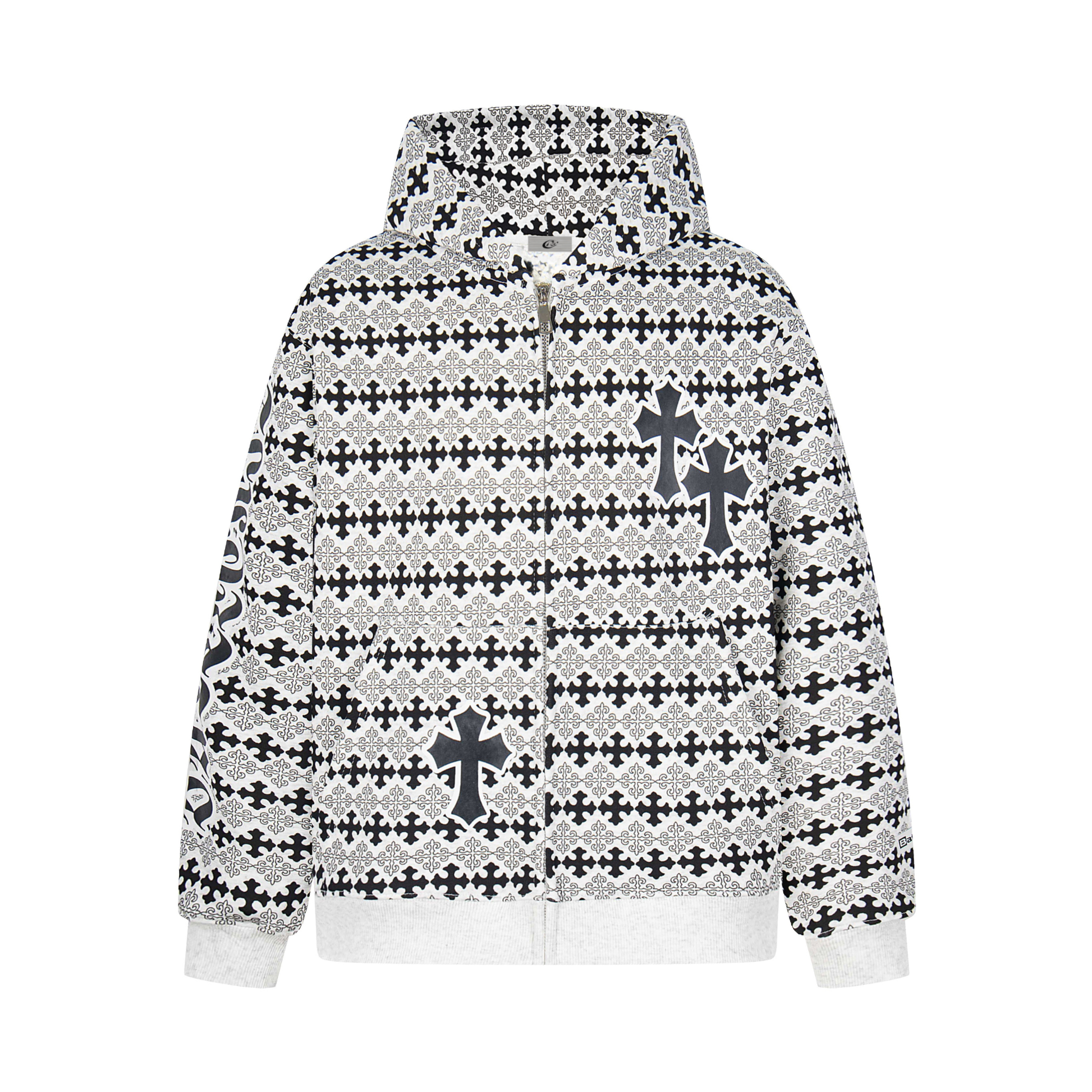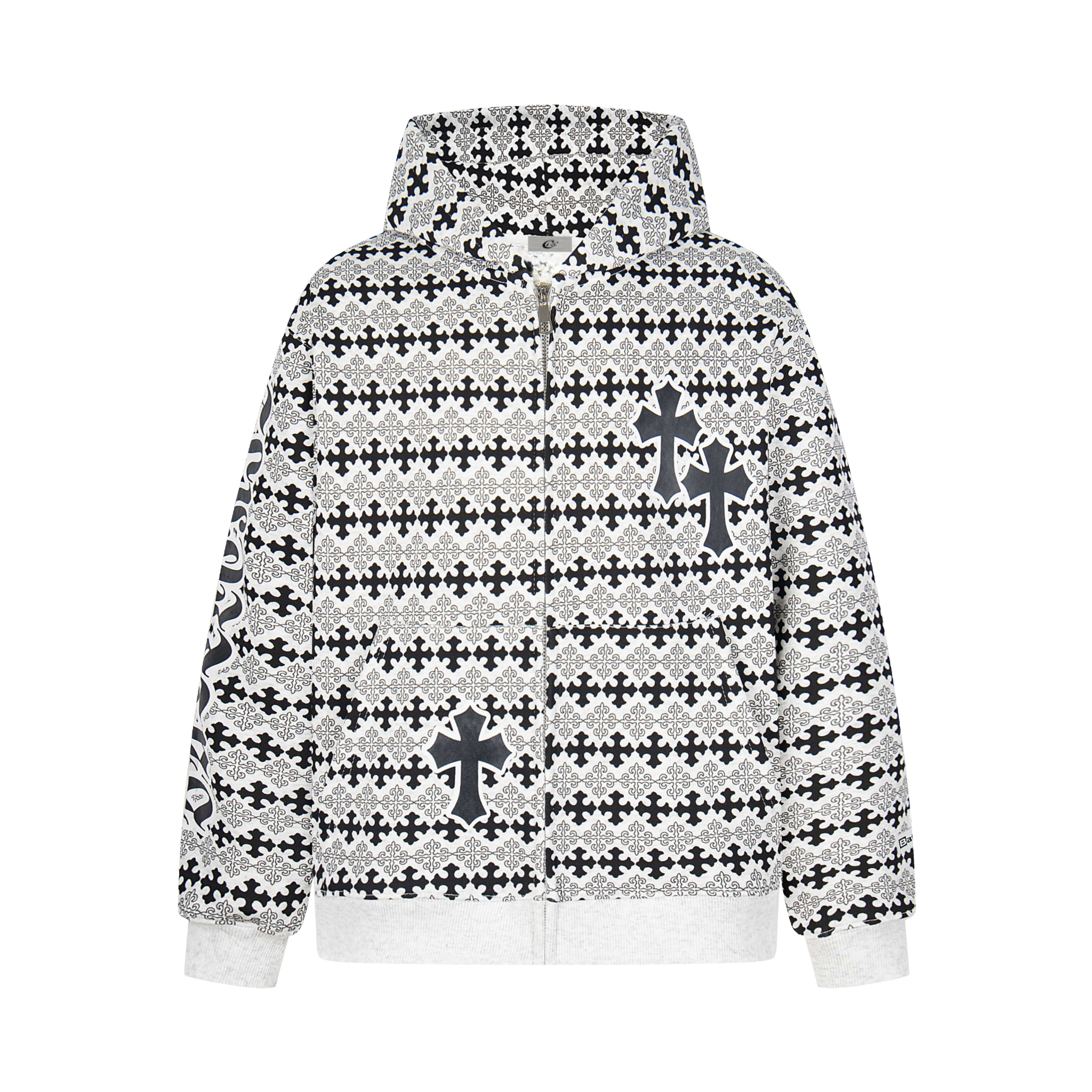 Clothing details: All-over cross pattern, Gothic embroidery and print, full front zipper, ribbed hem and cuffs, adjustable hood, soft fleece interior, and relaxed oversized fit